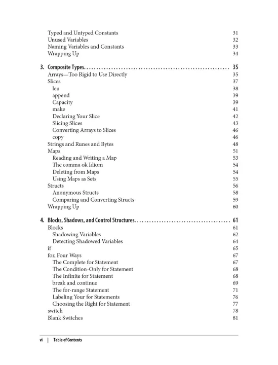 While most of Go’s features are found in other languages, Go makes different tradeoffs, so programs written in it have a different structure. Learning Go starts by looking at how to set up a Go development environment, and then covers variables, types, control structures, and functions. If you are tempted to skip over this material, resist the urge and take a look. It is often the details that make your Go code idiomatic. Some of what seems obvious at first glance might actually be subtly surprising when you think about it in depth
