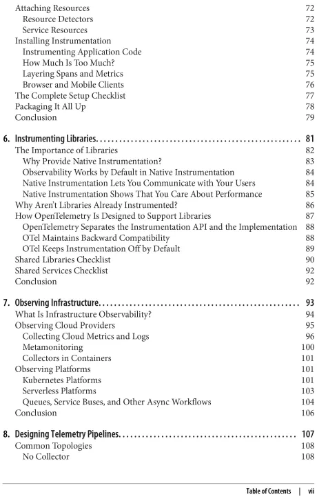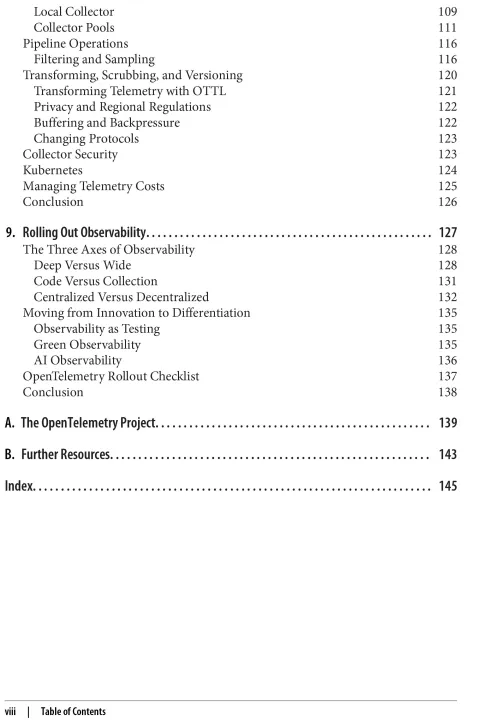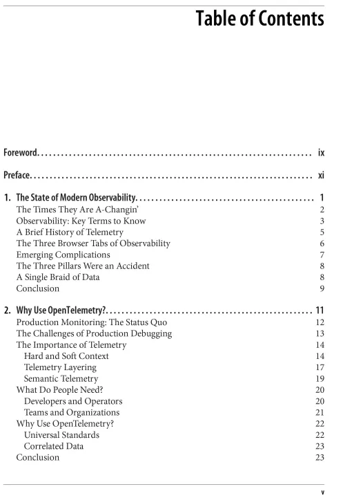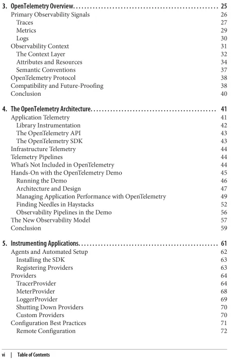 OpenTelemetry is a revolution in observability data. Instead of running multiple, uncoordinated pipelines, OpenTelemetry provides users with a single integrated stream of data, containing all common forms of observability â tracing, metrics, logs, RUM, eBPF, and more. OpenTelemetry also enables OSS libraries and services to provide their own native instrumentation â a first in the industry. Observability is a big subject. Starting with the question â why should I care about observability?â? this book offers a practical guide to setting up, operating, and troubleshooting a modern observability system. Every OpenTelemetry component is covered, as well as observability best practices for many popular cloud, platform, and data services, such as Kubernetes and AWS Lambda.