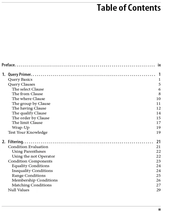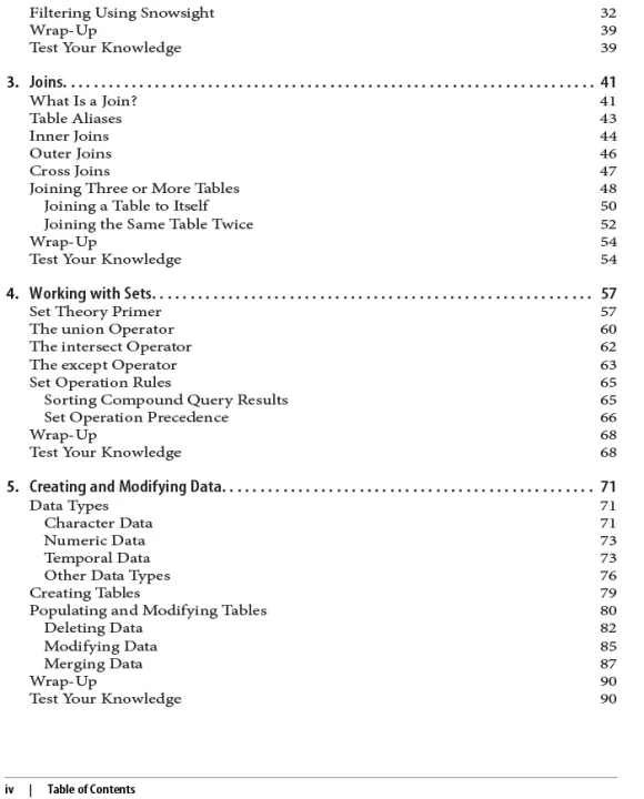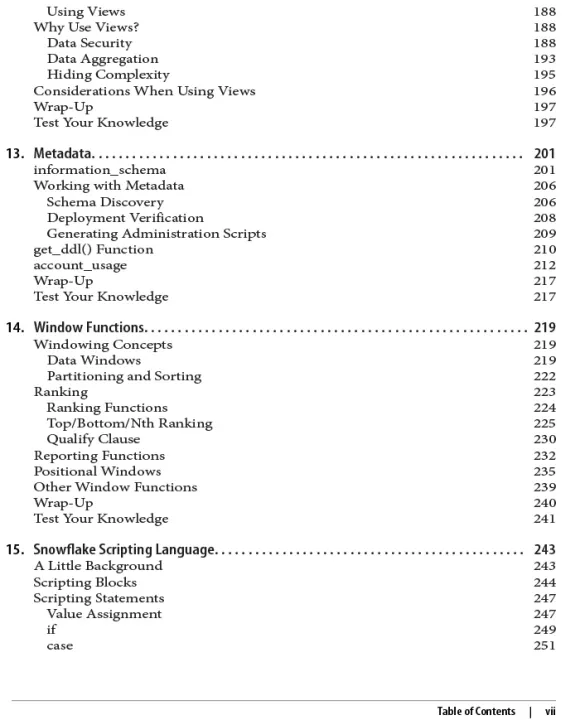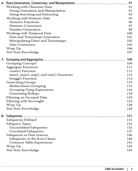 To help you on the path to becoming a Snowflake pro, this concise yet comprehensive guide reviews fundamentals and best practices for Snowflake's SQL and Scripting languages. Developers and data professionals will learn how to generate, modify, and query data in the Snowflake relational database management system as well as how to apply analytic functions for reporting. Author Alan Beaulieu also shows you how to create scripts, stored functions, and stored procedures to return data sets using Snowflake Scripting. This book is ideal whether you're new to databases and need to run queries or reports against a Snowflake database, or transitioning from databases such as Oracle, SQL Server, or MySQL to cloud-based platforms. With this book, you will: • Generate and modify Snowflake data using Insert, Update, Delete • Query data in Snowflake using Select, including joining multiple tables, using subqueries, and grouping • Apply analytic functions for performing subtotals, grand totals, row comparisons, and other reporting functionality • Build scripts combining SQL statements with looping, if-then-else, and exception handling • Learn how to build stored procedures and functions • Use stored procedures to return data sets