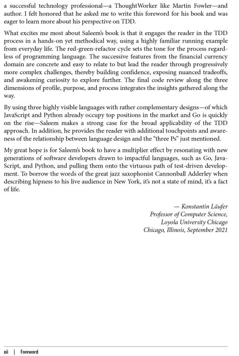 Your code is a testament to your skills as a developer. No matter what language you use, code should be clean, elegant, and uncluttered. By using test-driven development (TDD), you'll write code that's easy to understand, retains its elegance, and works for months, even years, to come. With this indispensable guide, you'll learn how to use TDD with three different languages: Go, JavaScript, and Python.
