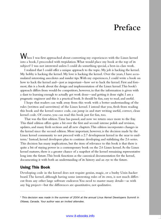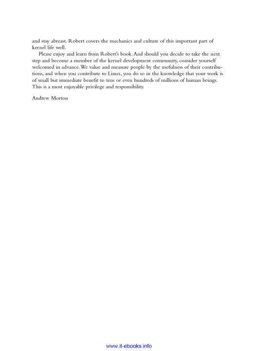 Linux Kernel Development details the design and implementation of the Linux kernel, presenting the content in a manner that is beneficial to those writing and developing kernel code, as well as to programmers seeking to better understand the operating system and become more efficient and productive in their coding. The book details the major subsystems and features of the Linux kernel, including its design, implementation, and interfaces. It covers the Linux kernel with both a practical and theoretical eye, which should appeal to readers with a variety of interests and needs. The author, a core kernel developer, shares valuable knowledge and experience on the 2.6 Linux kernel. Specific topics covered include process management, scheduling, time management and timers, the system call interface, memory addressing, memory management, the page cache, the VFS, kernel synchronization, portability concerns, and debugging techniques. This book covers the most interesting features of the Linux 2.6 kernel, including the CFS scheduler, preemptive kernel, block I/O layer, and I/O schedulers.