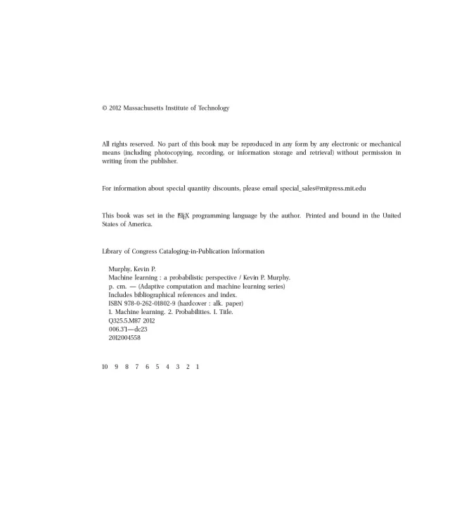 Today's Web-enabled deluge of electronic data calls for automated methods of data analysis. Machine learning provides these, developing methods that can automatically detect patterns in data and then use the uncovered patterns to predict future data. This textbook offers a comprehensive and self-contained introduction to the field of machine learning, based on a unified, probabilistic approach. The coverage combines breadth and depth, offering necessary background material on such topics as probability, optimization, and linear algebra as well as discussion of recent developments in the field, including conditional random fields, L1 regularization, and deep learning. The book is written in an informal, accessible style, complete with pseudo-code for the most important algorithms. All topics are copiously illustrated with color images and worked examples drawn from such application domains as biology, text processing, computer vision, and robotics. Rather than providing a