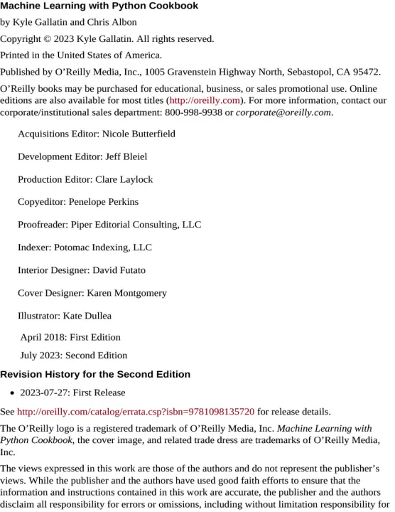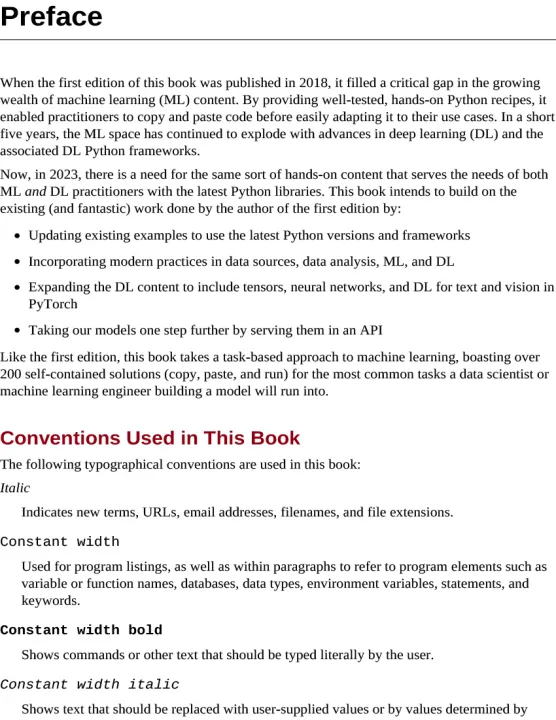 Each recipe in this updated edition includes code that you can copy, paste, and run with a toy dataset to ensure it works. From there, you can adapt these recipes according to your use case or application. Recipes include a discussion that explains the solution and provides meaningful context. Go beyond theory and concepts by learning the nuts and bolts you need to construct working machine learning applications.