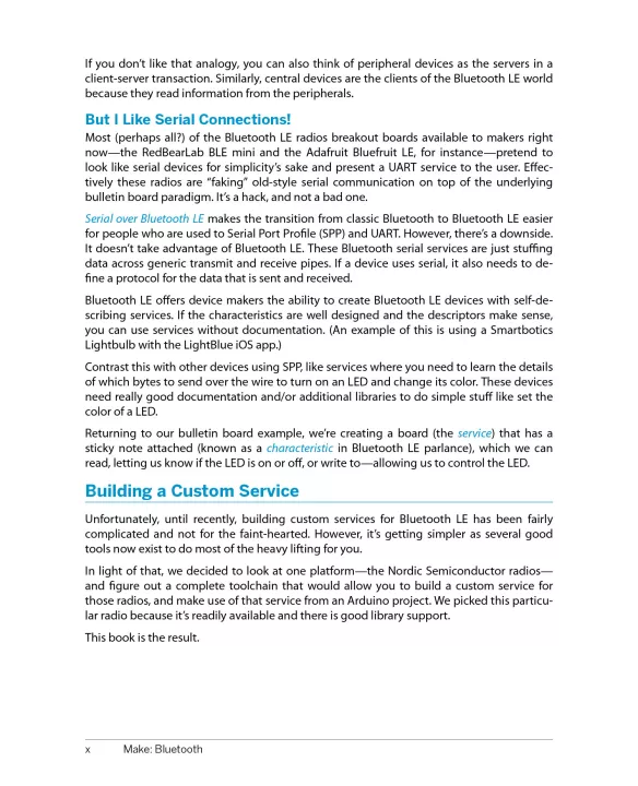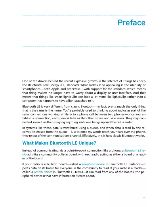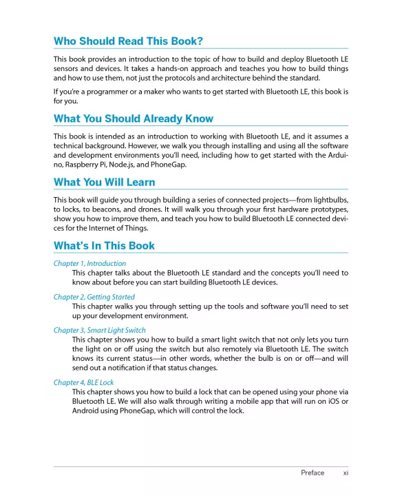 This book is where your adventures with Bluetooth LE begin. You'll start your journey by getting familiar with your hardware options: Arduino, BLE modules, computers (including Raspberry Pi!), and mobile phones. From there, you'll write code and wire circuits to connect off-the-shelf sensors, and even go all the way to writing your own Bluetooth Services. Along the way you'll look at lightbulbs, locks, and Apple's iBeacon technology, as well as get an understanding of Bluetooth security--both how to beat other people's security, and how to make your hardware secure.