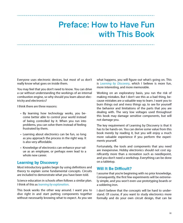 Here you will find unique, photographically precise diagrams of breadboarded components, to help you build circuits with speed and precision. A new shopping guide and a simplified range of components, will minimize your investment in parts for the projects. A completely new section on the Arduino shows you how to write properly structured programs instead of just downloading other people's code. Projects have been reworked to provide additional features, and the book has been restructured to offer a step-by-step learning process that is as clear and visually pleasing on handheld devices as it is on paper. Full color is used throughout.