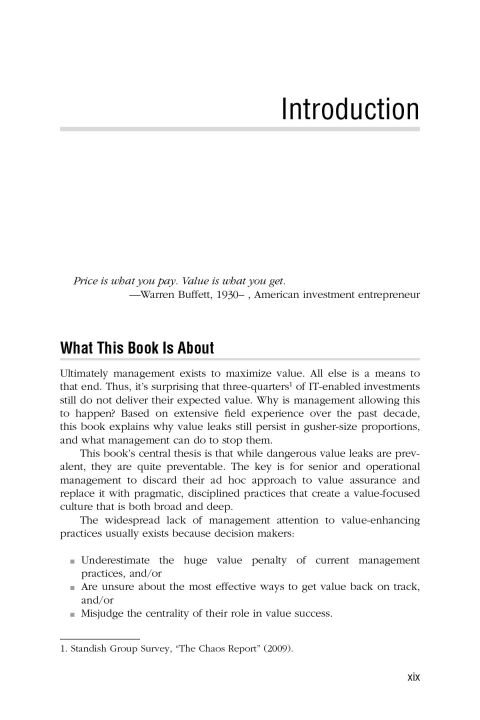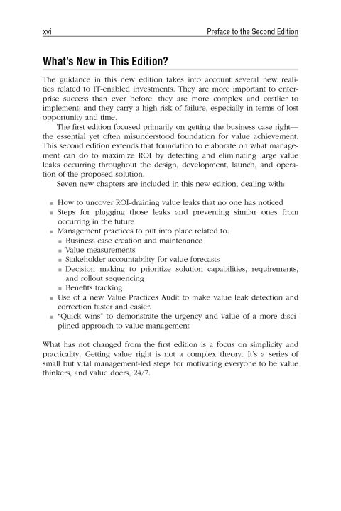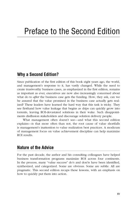 "A guide to getting the crucial business case right-every time Showing professionals how to calculate the value of typical budgeting and funding requests quickly and easily, Making Technology Investments Profitable, Second Edition applies the "Value Realization" process, using proven strategies that maximize the business payoff from IT projects. Filled with case studies, this innovative book enables managers to confidently quantify, in a matter of minutes, the true business value of funding a desired project. New edition explains how to proactively manage the conversion of a business case's value promise to its value realization Includes dozens of new case studies on realizing maximum value from IT enabled investments from various industries and around the world Most of the popular checklists and tables from the current edition will be retained and numerous new ones will be added A dedicated Web site containing additional material, case studies, chat rooms, and blogs on the value-realization process Providing new insights on how to get the crucial business case right, while also explaining how to proactively manage the conversion of the business case's value promise into the value reality of a completed project, the Second Edition of Making Technology Investments Profitable unveils an unexpectedly straightforward solution to this disconcerting situation-a very pragmatic process of value realization involving role, responsibility, and mindset changes for senior executives, as well as project managers and technical staff."--Provided by publisher.�