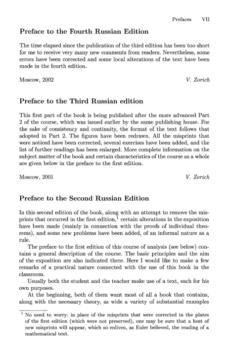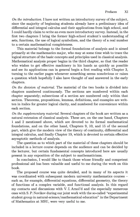The main difference between the second and first editions is the addition of a series of appendices to each volume. There are six of them in the first volume and five in the second. The subjects of these appendices are diverse. They are meant to be useful to both students (in mathematics and physics) and teachers, who may be motivated by different goals. Some of the appendices are surveys, both prospective and retrospective. The final survey establishes important conceptual connections between analysis and other parts of mathematics.