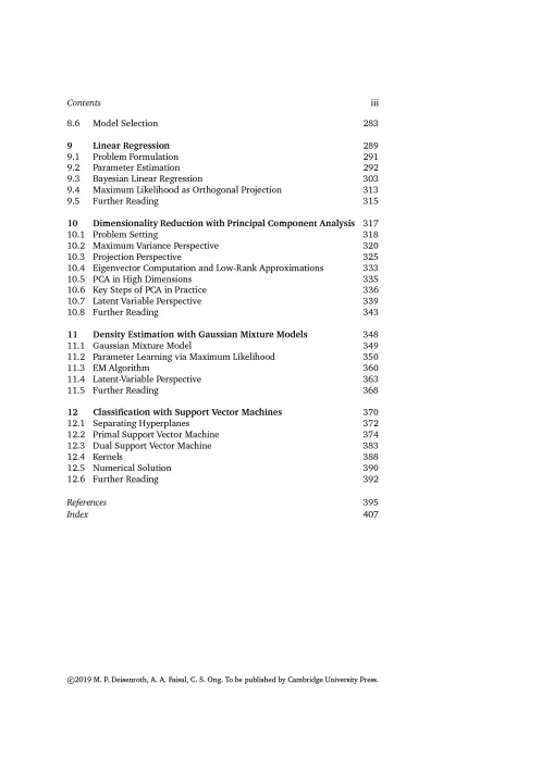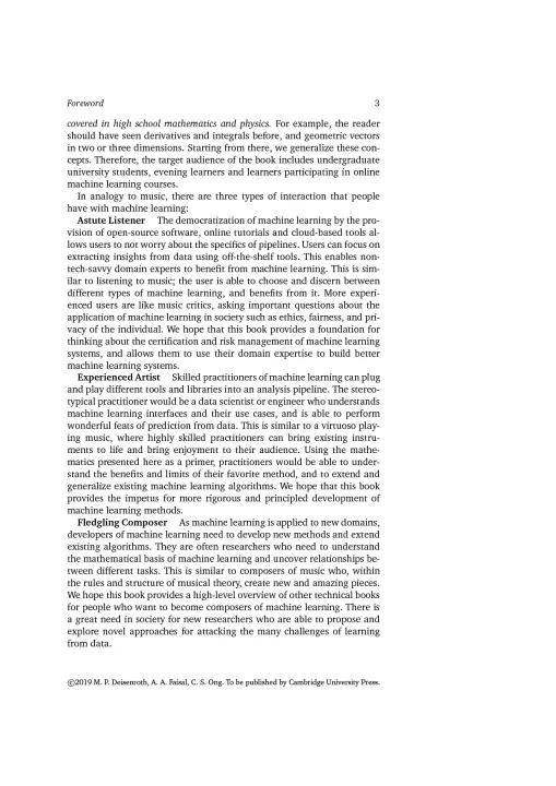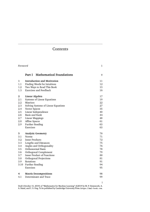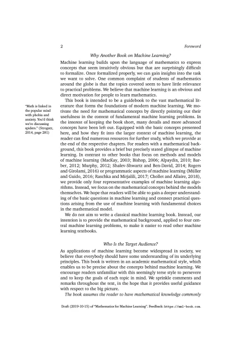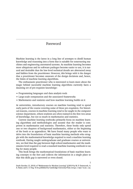 The fundamental mathematical tools needed to understand machine learning include linear algebra, analytic geometry, matrix decompositions, vector calculus, optimization, probability and statistics. These topics are traditionally taught in disparate courses, making it hard for data science or computer science students, or professionals, to efficiently learn the mathematics. This self-contained textbook bridges the gap between mathematical and machine learning texts, introducing the mathematical concepts with a minimum of prerequisites. It uses these concepts to derive four central machine learning methods: linear regression, principal component analysis, Gaussian mixture models and support vector machines. For students and others with a mathematical background, these derivations provide a starting point to machine learning texts. For those learning the mathematics for the first time, the methods help build intuition and practical experience with applying mathematical concepts. Every chapter includes worked examples and exercises to test understanding. Programming tutorials are offered on the book's web site