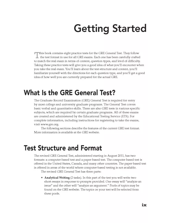 •8 full-length practice exams designed to match the actual test-taking experience•16 writing prompts for the Analytical Writing essays•16 high-scoring sample essays that show you what the test graders are looking for•An up-to-date introduction to the GRE and scoring•A concise overview of question types found in the Verbal and Quantitative Reasoning sections•Thorough answer-explanations for every question
