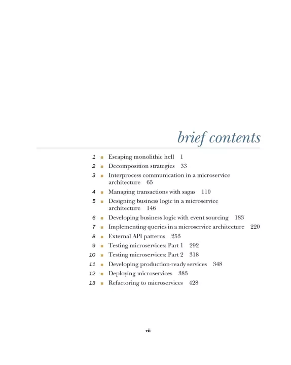 Microservices Patterns teaches you how to develop and deploy production-quality microservices-based applications. This invaluable set of design patterns builds on decades of distributed system experience, adding new patterns for writing services and composing them into systems that scale and perform reliably under real-world conditions. More than just a patterns catalog, this practical guide offers experience-driven advice to help you design, implement, test, and deploy your microservices-based application.