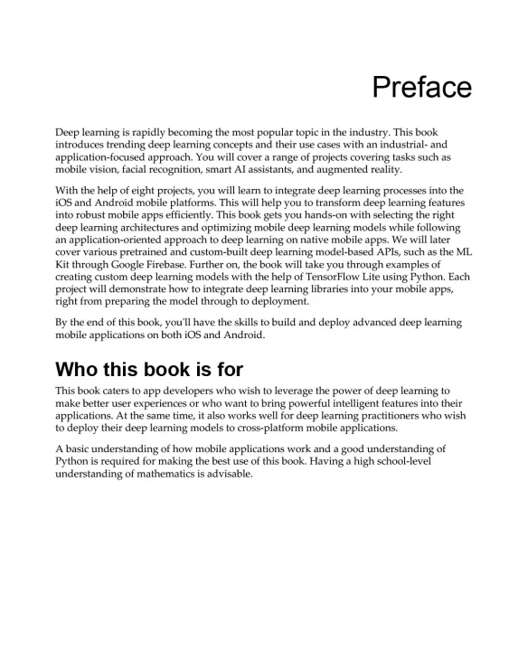 This book is for data scientists, deep learning and computer vision engineers, and natural language processing (NLP) engineers who want to build smart mobile apps using deep learning methods. You will also find this book useful if you want to improve your mobile app's user interface (UI) by harnessing the potential of deep learning. Basic knowledge of neural networks and coding experience in Python will be beneficial to get started with this book.