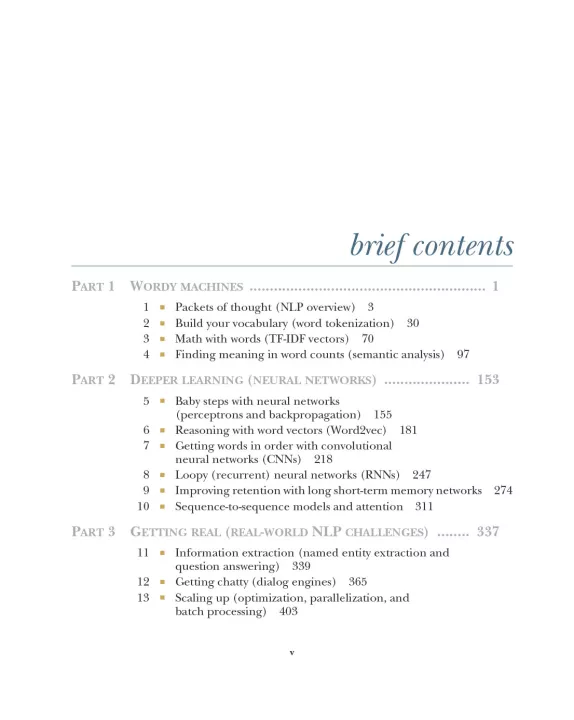 Natural Language Processing in Action is your guide to building machines that can read and interpret human language. In it, you'll use readily available Python packages to capture the meaning in text and react accordingly. The book expands traditional NLP approaches to include neural networks, modern deep learning algorithms, and generative techniques as you tackle real-world problems like extracting dates and names, composing text, and answering free-form questions.