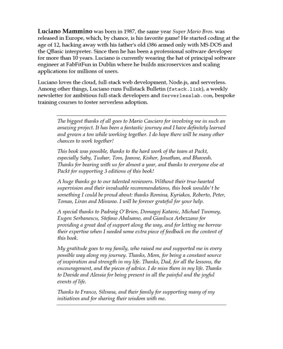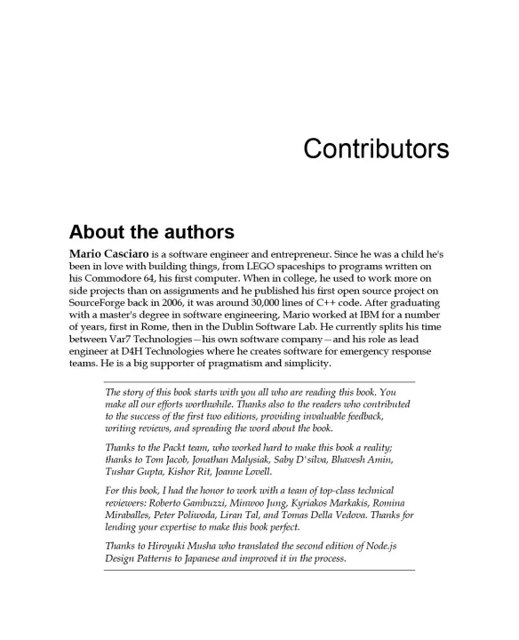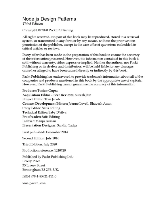 We kick off by exploring the basics of Node.js, analyzing its asynchronous event driven architecture and its fundamental design patterns. We then show you how to build asynchronous control flow patterns with callbacks, promises and async/await. Next, we dive into Node.js streams, unveiling their power and showing you how to use them at their full capacity. Following streams is an analysis of different creational, structural, and behavioral design patterns that take full advantage of JavaScript and Node.js. Lastly, the book dives into more advanced concepts such as Universal JavaScript, scalability and messaging patterns to help you build enterprise-grade distributed applications.