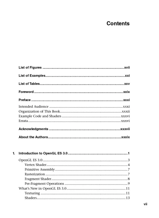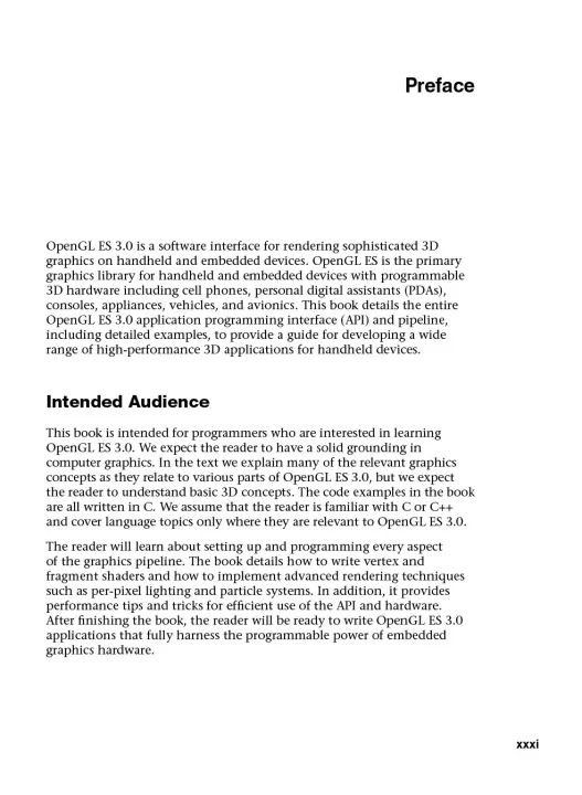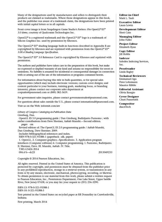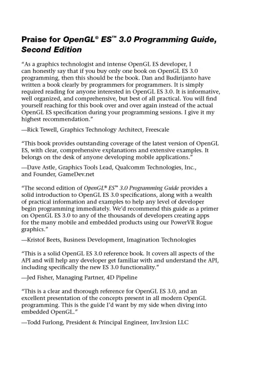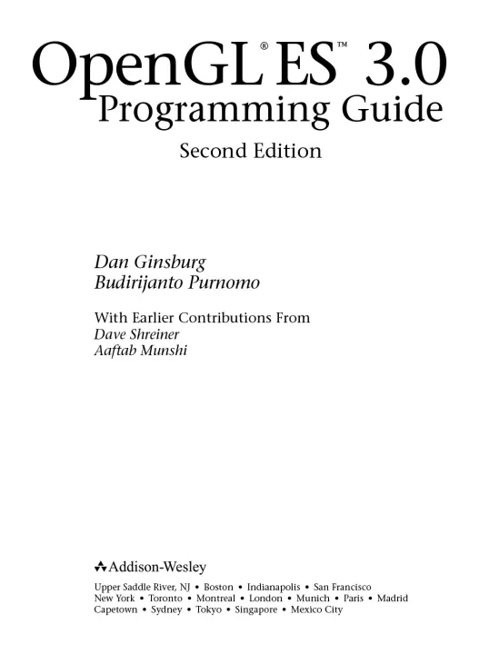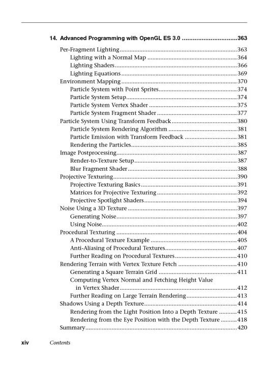 3.0 Programming Guide, Second Edition, the authors cover the entire API and Shading Language. They carefully introduce OpenGL ES 3.0 features such as shadow mapping, instancing, multiple render targets, uniform buffer objects, texture compression, program binaries, and transform feedback.