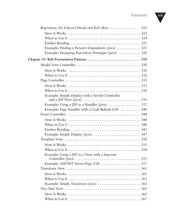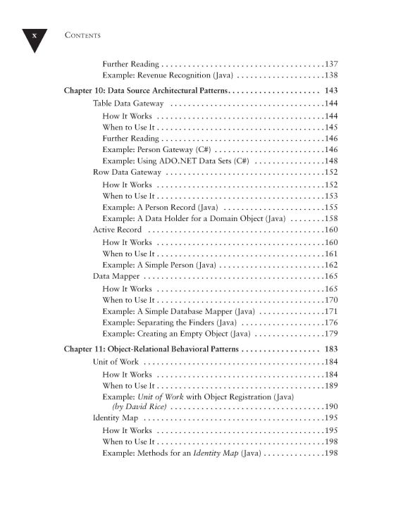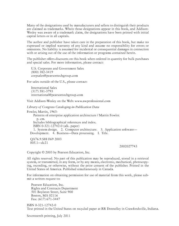 Developers of enterprise applications (e.g reservation systems, supply chain programs, financial systems, etc.) face a unique set of challenges, different than those faced by their desktop system and embedded system peers. For this reason, enterprise developers must uncover their own solutions. In this new book, noted software engineering expert Martin Fowler turns his attention to enterprise application development. He helps professionals understand the complex -- yet critical -- aspects of architecture. While architecture is important to all application development, it is particularly critical to the success of an enterprise project, where issues such as performance and concurrent multi-user access are paramount. The book presents patterns (proven solutions to recurring problems) in enterprise architecture, and the context provided by the author enables the reader to make the proper choices when faced with a difficult design decision.