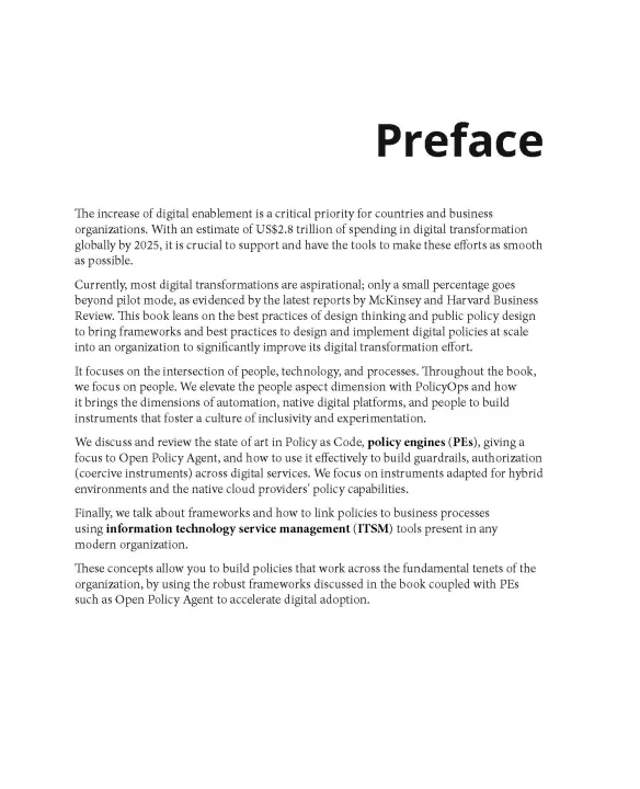 Policy as Code (PaC) is a powerful paradigm that enables organizations to implement, validate, and measure policies at scale. Policy Design in the Age of Digital Adoption is a comprehensive guide to understanding policies, their design, and implementation for cloud environments using a DevOps-based framework. You'll discover how to create the necessary automation, its integration, and which stakeholders to involve.
