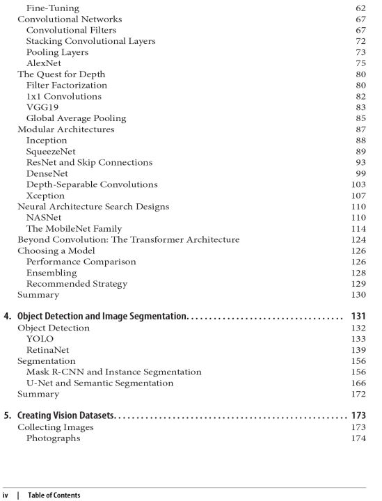 This practical book shows you how to employ machine learning models to extract information from images. ML engineers and data scientists will learn how to solve a variety of image problems including classification, object detection, autoencoders, image generation, counting, and captioning with proven ML techniques. This book provides a great introduction to end-to-end deep learning: dataset creation, data preprocessing, model design, model training, evaluation, deployment, and interpretability. Google engineers Valliappa Lakshmanan, Martin Görner, and Ryan Gillard show you how to develop accurate and explainable computer vision ML models and put them into large-scale production using robust ML architecture in a flexible and maintainable way. You'll learn how to design, train, evaluate, and predict with models written in TensorFlow or Keras. You'll learn how to: • Design ML architecture for computer vision tasks • Select a model (such as ResNet, SqueezeNet, or EfficientNet) appropriate to your task • Create an end-to-end ML pipeline to train, evaluate, deploy, and explain your model • Preprocess images for data augmentation and to support learnability • Incorporate explainability and responsible AI best practices • Deploy image models as web services or on edge devices • Monitor and manage ML models