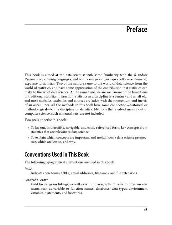 Many data science resources incorporate statistical methods but lack a deeper statistical perspective. If you’re familiar with the R or Python programming languages and have some exposure to statistics, this quick reference bridges the gap in an accessible, readable format.
