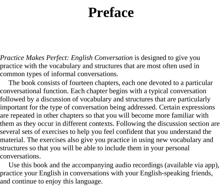 Practice Makes Perfect: English Conversation is organized around 12 units that present specific conversational situations and common, everyday scenarios. Each unit offers helpful instructions on correct pronunciation, grammar, syntax, and word usage. The exclusive McGraw-Hill Language app features streaming audio recordings of all dialogues in the book plus the answers to more than 100 exercises.