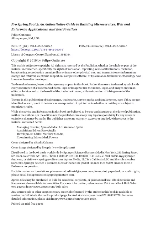 Pro Spring Boot 2 is an essential book for your Spring learning and reference library.