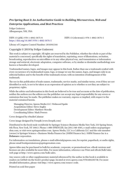 Pro Spring Boot 2 is an essential book for your Spring learning and reference library.