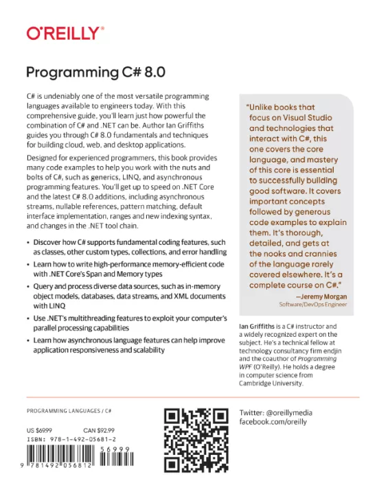 C# is undeniably one of the most versatile programming languages available to engineers today. With this comprehensive guide, you’ll learn just how powerful the combination of C# and .NET can be. Author Ian Griffiths guides you through C# 8.0 fundamentals and techniques for building cloud, web, and desktop applications.