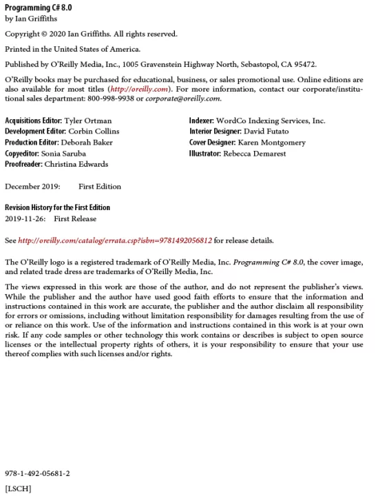 Designed for experienced programmers, this book provides many code examples to help you work with the nuts and bolts of C#, such as generics, LINQ, and asynchronous programming features. You’ll get up to speed on .NET Core and the latest C# 8.0 additions, including asynchronous streams, nullable references, pattern matching, default interface implementation, ranges and new indexing syntax, and changes in the .NET tool chain.
