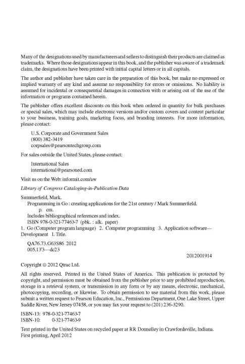 oday’s most exciting new programming language, Go, is designed from the ground up to help you easily leverage all the power of today’s multicore hardware. With this guide, pioneering Go programmer Mark Summerfield shows how to write code that takes full advantage of Go’s breakthrough features and idioms.