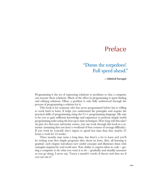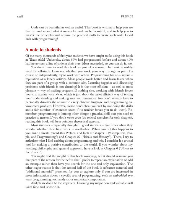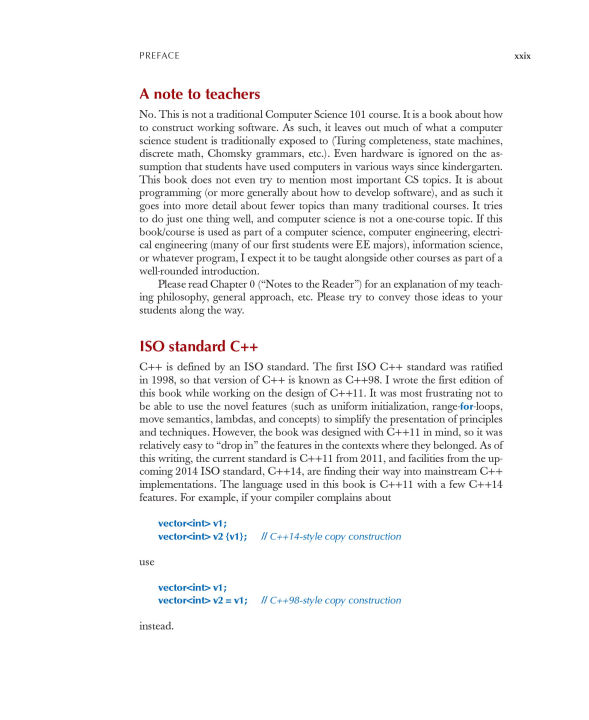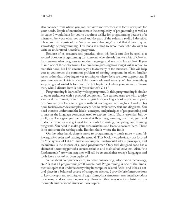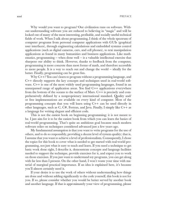 An Introduction to Programming by the Inventor of C++Preparation for Programming in the Real WorldThe book assumes that you aim eventually to write non-trivial programs, whether for work in software development or in some other technical field.Focus on Fundamental Concepts and TechniquesThe book explains fundamental concepts and techniques in greater depth than traditional introductions. This approach will give you a solid foundation for writing useful, correct, maintainable, and efficient code.Programming with Today's C++ (C++11 and C++14)The book is an introduction to programming in general, including object-oriented programming and generic programming. It is also a solid introduction to the C++ programming language, one of the most widely used languages for real-world software. The book presents modern C++ programming techniques from the start,introducing the C++ standard library and C++11 and C++14 features to simplify programming tasks.For Beginners—And Anyone Who Wants to Learn Something NewThe book is primarily designed for people who have never programmed before, and it has been tested with many thousands of first-year university students. It has also been extensively used for self-study. Also, practitioners and advanced students have gained new insight and guidance by seeing how a master approaches the elements of his art.Provides a Broad ViewThe first half of the book covers a wide range of essential concepts, design and programming techniques, language features, and libraries. Those will enable you to write programs involving input, output, computation, and simple graphics. The second half explores more specialized topics (such as text processing, testing, and the C programming language) and provides abundant reference material. Source code and support supplements are available from the author's website.