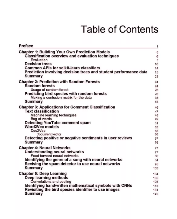 This book begins with helping you to build your first prediction model using the popular Python library, scikit-learn. You will understand how to build a classifier using an effective machine learning technique, random forest, and decision trees. With exciting projects on predictin