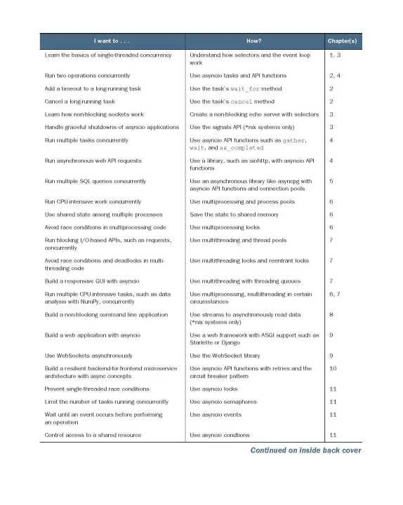 Python is flexible, versatile, and easy to learn. It can also be very slow compared to lower-level languages. Python Concurrency with asyncio teaches you how to boost Python's performance by applying a variety of concurrency techniques. You'll learn how the complex-but-powerful asyncio library can achieve concurrency with just a single thread and use asyncio's APIs to run multiple web requests and database queries simultaneously. The book covers using asyncio with the entire Python concurrency landscape, including multiprocessing and multithreading.
