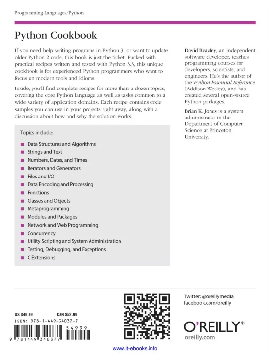 If you need help writing programs in Python 3, or want to update older Python 2 code, this book is just the ticket. Packed with practical recipes written and tested with Python 3.3, this unique cookbook is for experienced Python programmers who want to focus on modern tools and idioms. Inside, you'll find complete recipes for more than a dozen topics, covering the core Python language as well as tasks common to a wide variety of application domains. Each recipe contains code samples you can use in your projects right away, along with a discussion about how and why the solution works.