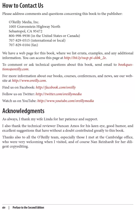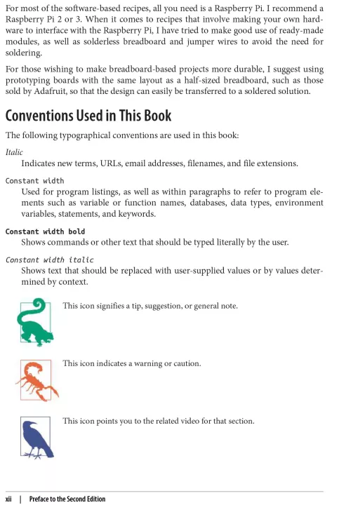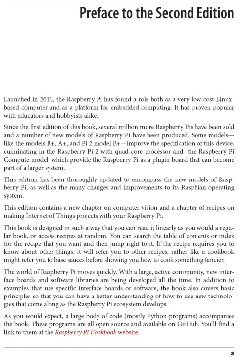 With millions of new users and several new models, the Raspberry Pi ecosystem continues to expand—along with a lot of new questions about the Pi’s capabilities. The second edition of this popular cookbook provides more than 240 hands-on recipes for running this tiny low-cost computer with Linux, programming it with Python, and hooking up sensors, motors, and other hardware—including Arduino and the Internet of Things.