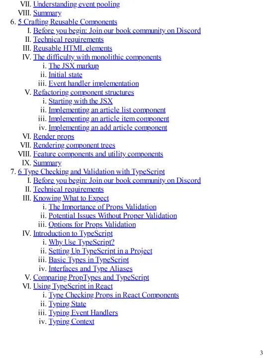 Part 1 introduces you to React. You'll discover JSX syntax, hooks, functional components, and event handling, learn techniques to fetch data from a server, and tackle the tricky problem of state management. Once you're comfortable with writing React in JavaScript, you'll pick up TypeScript development in later chapters.