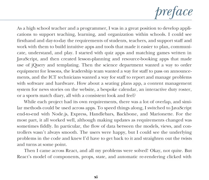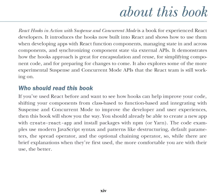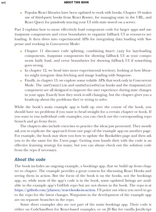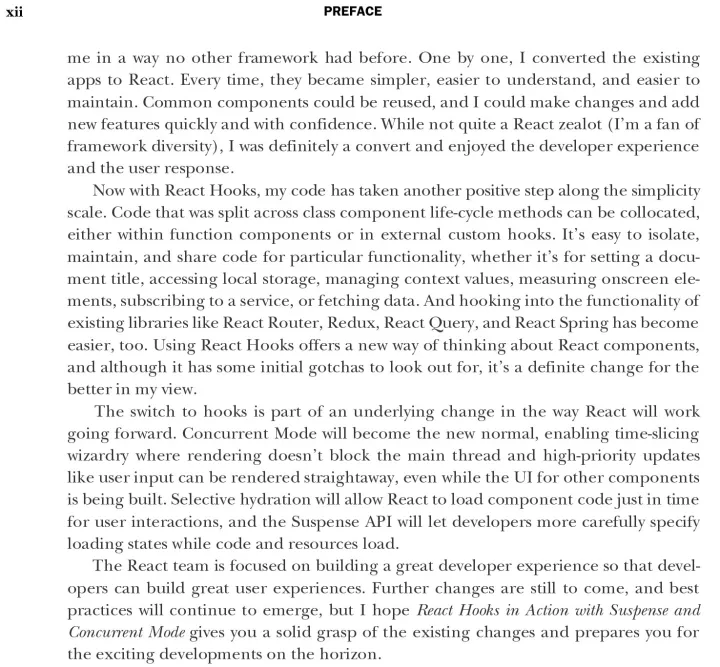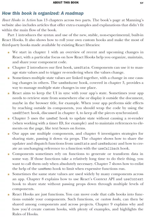 React Hooks in Action shows you how to use Hooks to make your codebase simpler and more reusable, and your applications faster and more responsive. As you build a resource-booking example application, you’ll learn to develop components with local, shared, and application states. Along the way, you’ll discover different approaches to data fetching to improve user experience, and you’ll explore third party hooks in the evolving React ecosystem.