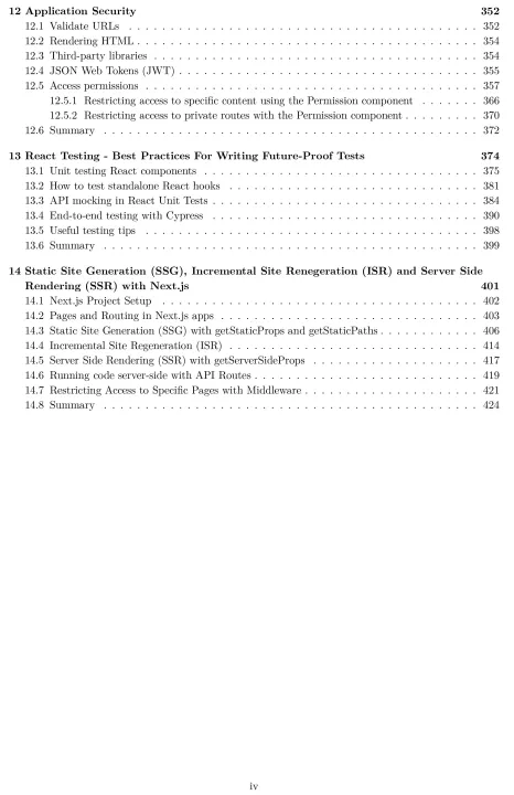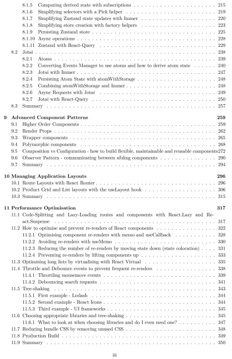 This book covers many advanced topics to help you build maintainable, scalable and performant React applications, such as scalable project architecture, useful techniques for handling async operations and API states, advanced component patterns, performance optimisation, local and global state management patterns, static site generation (SSG) and server side rendering (SSR) with Next.js and more.