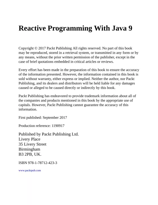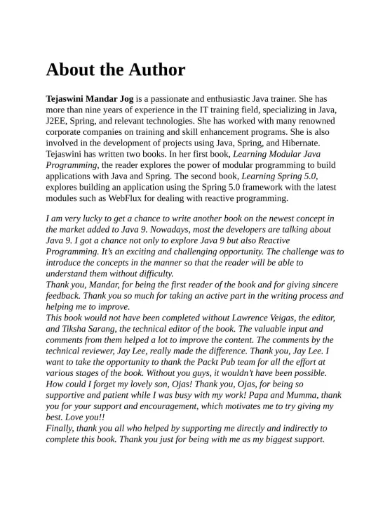 This book begins by explaining what Reactive programming is, the Reactive manifesto, and the Reactive Streams specifi cation. It uses Java 9 to introduce the declarative and functional paradigm, which is necessary to write programs in the Reactive style. It explains Java 9's Flow API, an adoption of the Reactive Streams specifi cation. From this point on, it focuses on RxJava 2.0, covering topics such as creating, transforming,fi ltering, combining, and testing Observables. It discusses how to use Java's popular framework, Spring, to build event-driven, Reactive applications. You will also learn how to implement resiliency patterns using Hystrix. By the end, you will be fully equipped with the tools and techniques needed to implement robust, event-driven, Reactive applications.