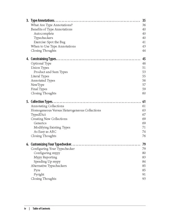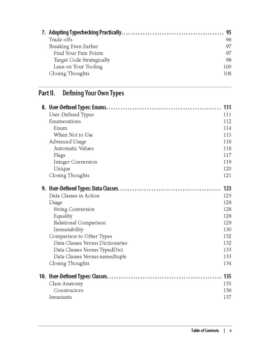 In this practical book, author Patrick Viafore shows you how to use Python's type system to the max. You'll look at user-defined types, such as classes and enums, and Python's type hinting system. You'll also learn how to make Python extensible and how to use a comprehensive testing strategy as a safety net. With these tips and techniques, you'll write clearer and more maintainable code.