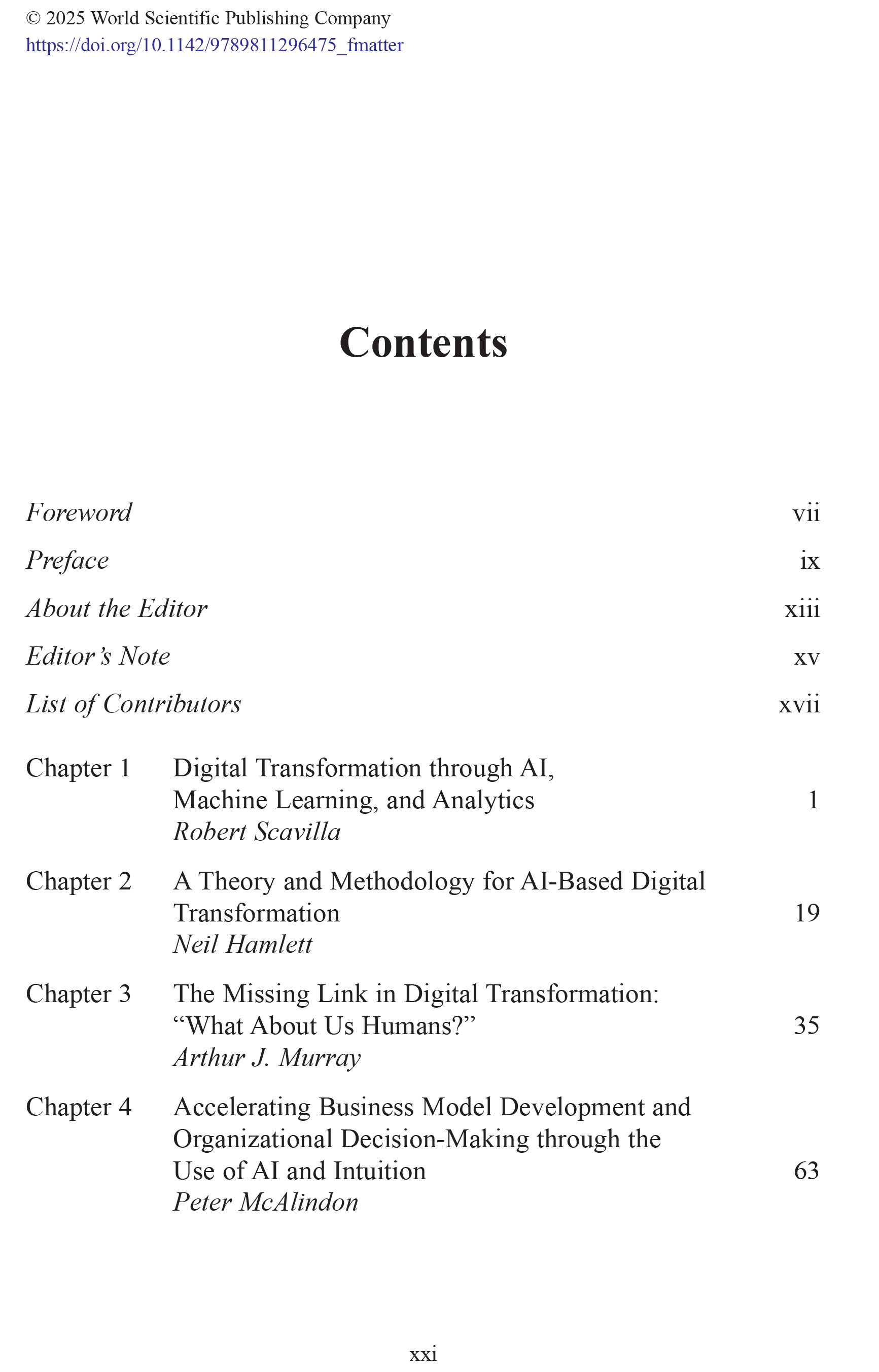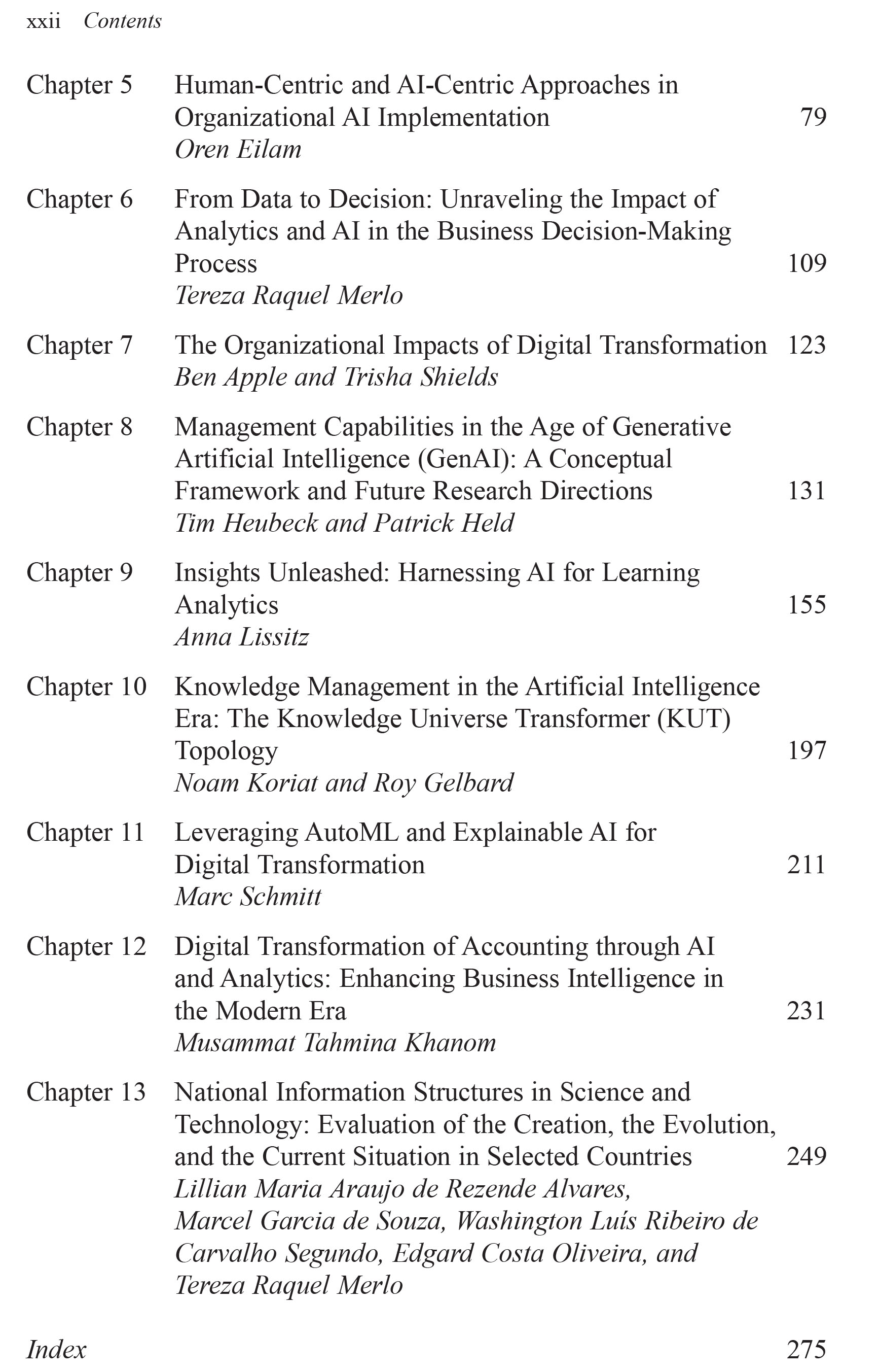 Due to the rapid emergence of the development and use of Analytics and AI in organizations, this book focuses on these aspects related to digital transformation. We are in the midst of the GenAI craze, with prompt engineering, large language models, and AI ethics playing key roles. According to estimates, about 329 million terabytes of data are created each day [https: //explodingtopics.com/blog/data-generated-per-day] or approximately 120 zettabytes per year. With this overabundance of data, in all types of forms, the use of Analytics and AI are essential techniques to help organizations make sense of their digital transformation efforts. In this book volume, we are fortunate to have the contributions of leading individuals worldwide in various sectors, such as organization AI implementation, business management innovation and data gathering using artificial intelligence.