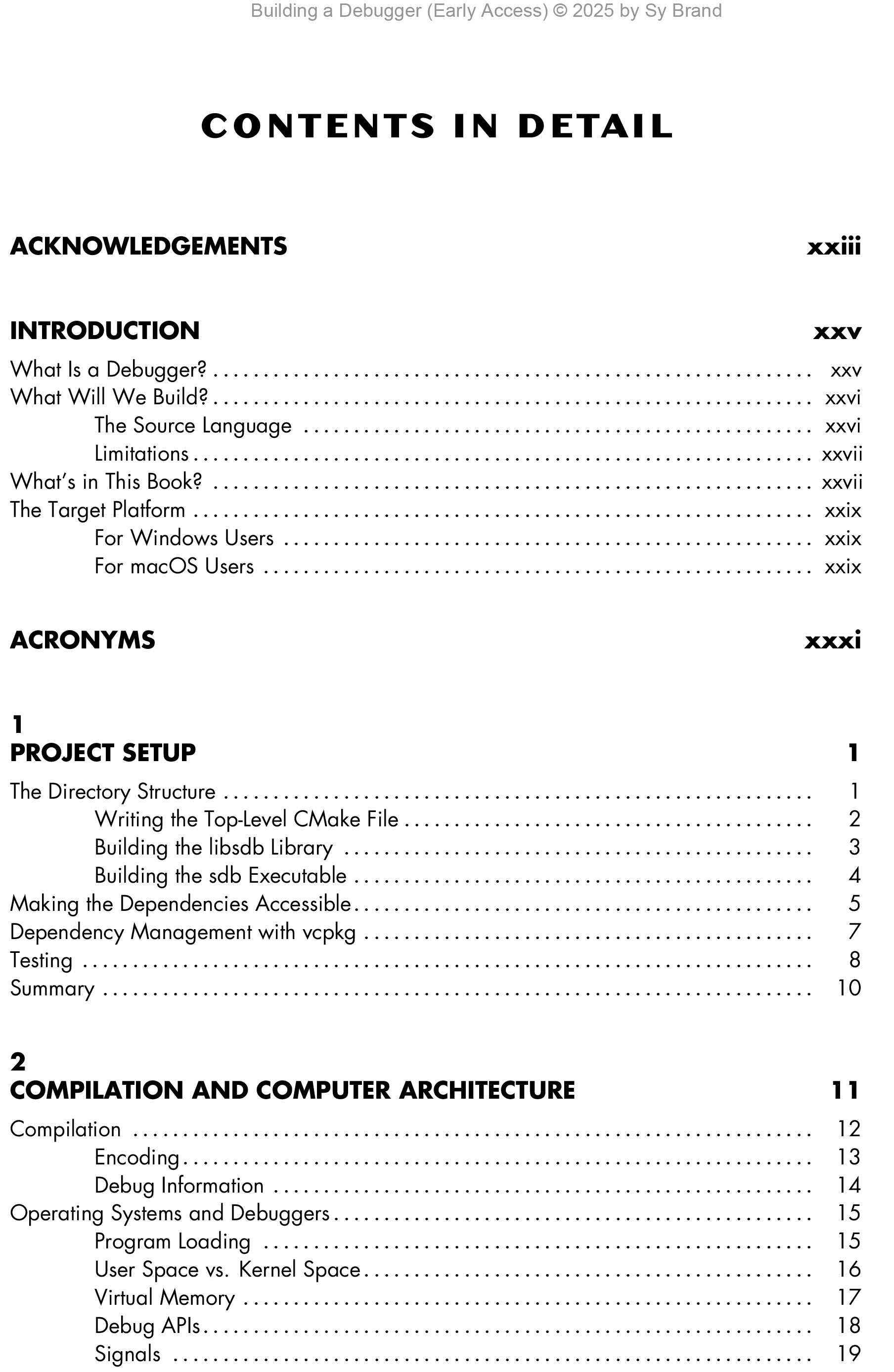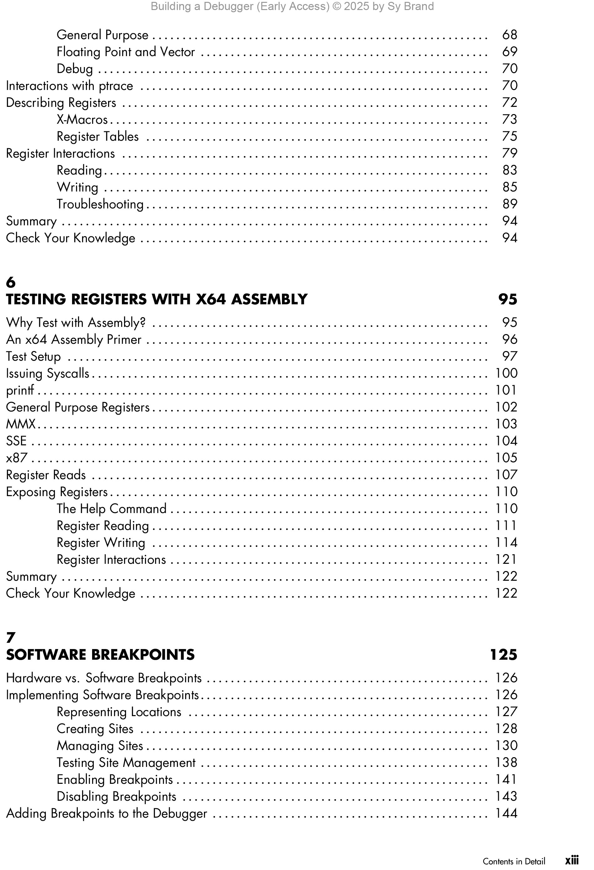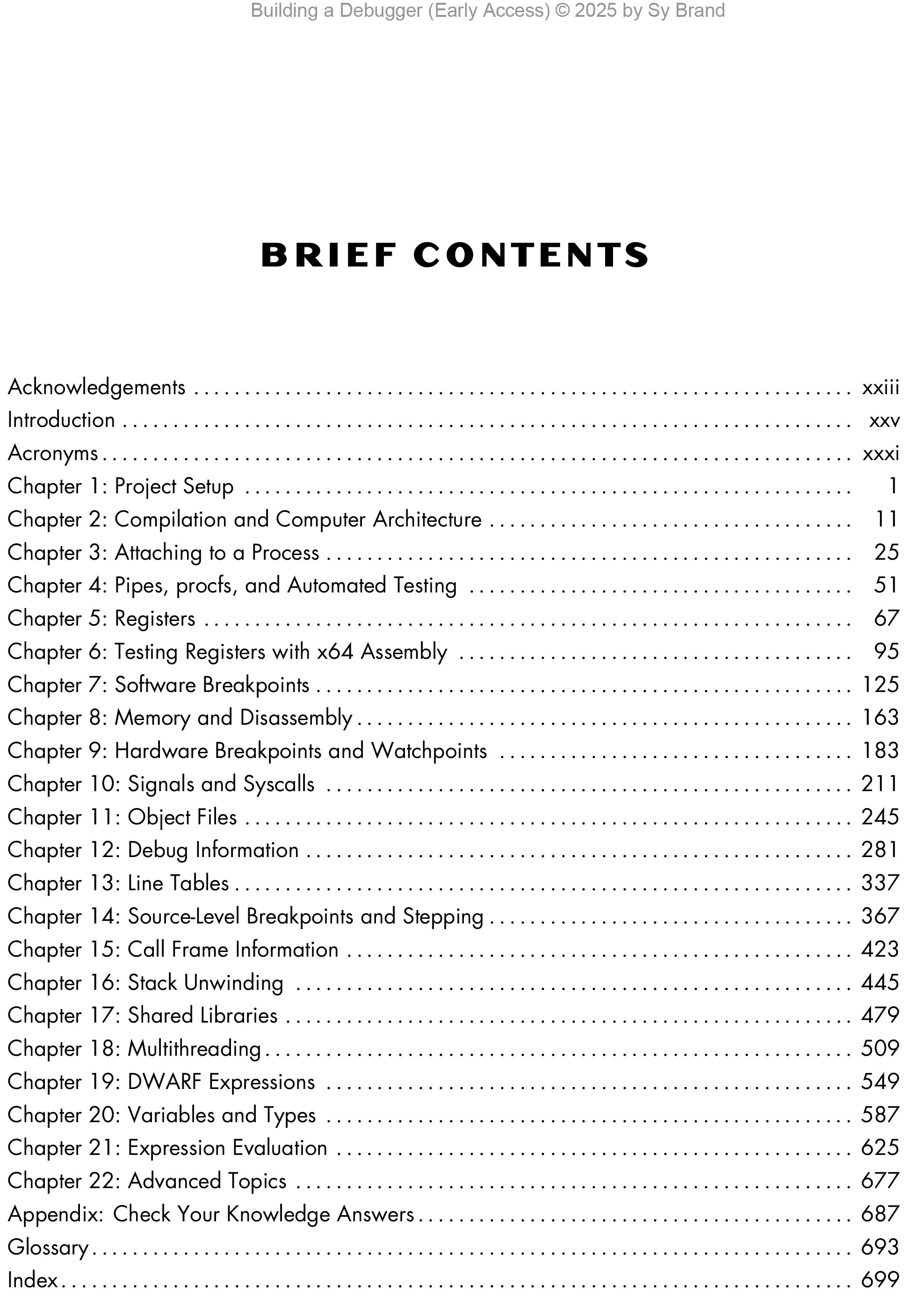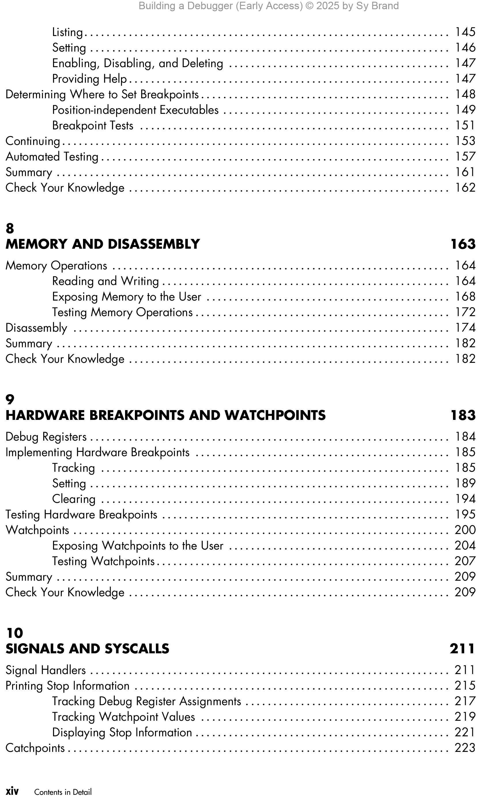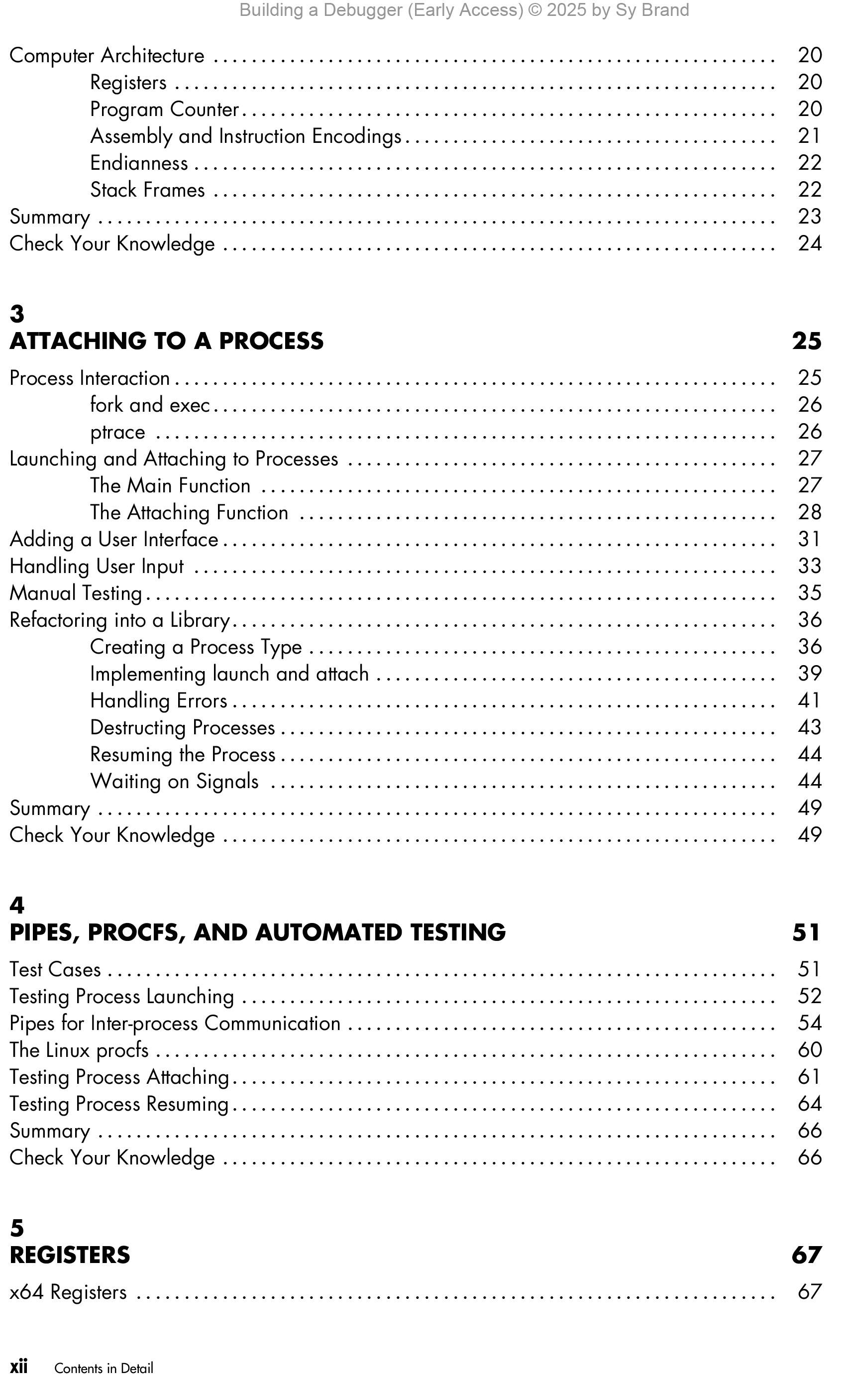 As you add features to your debugger, you’ll also pick up a wealth of knowledge about operating systems, compilers, software testing, and low-level programming that you can use in your day-to-day development.