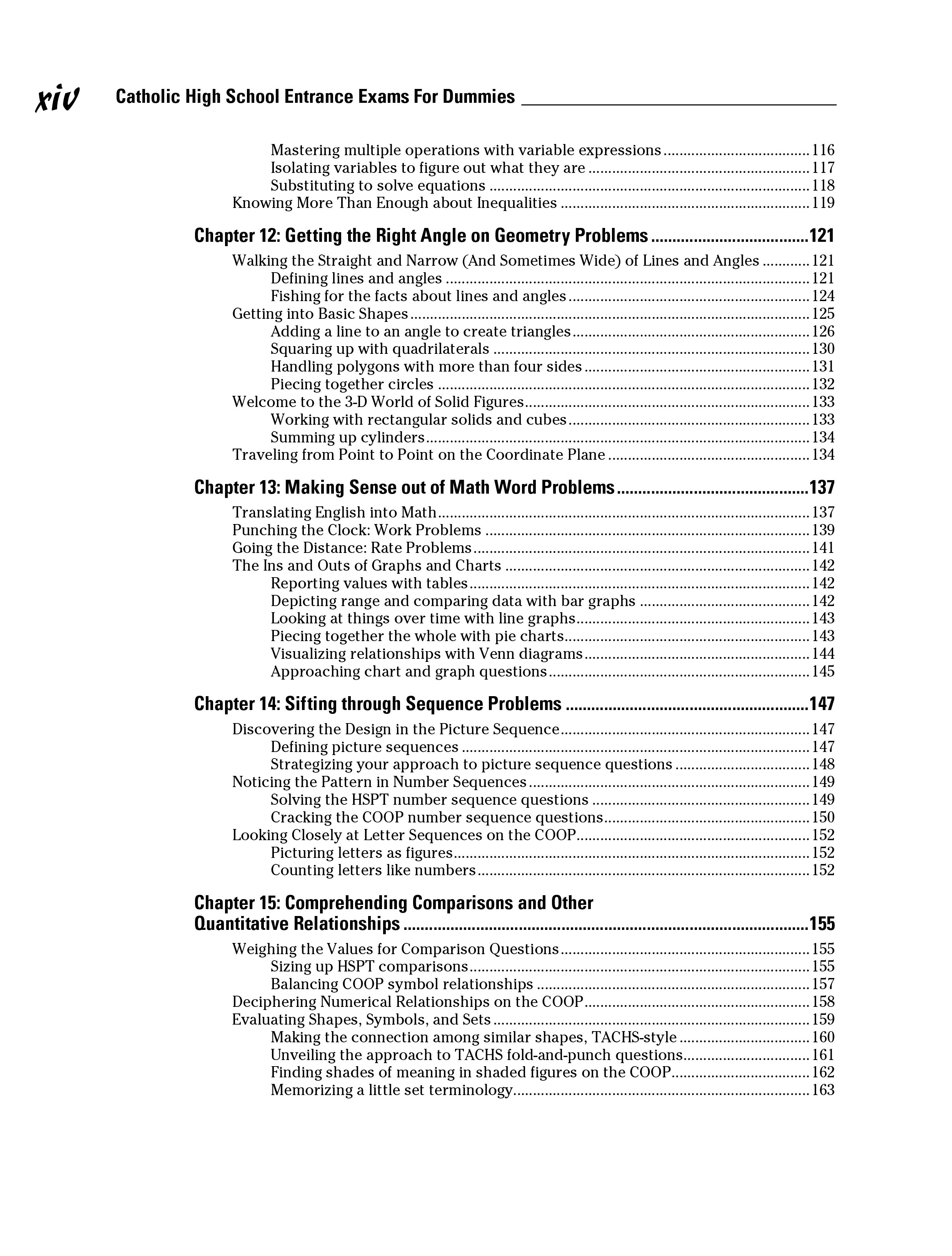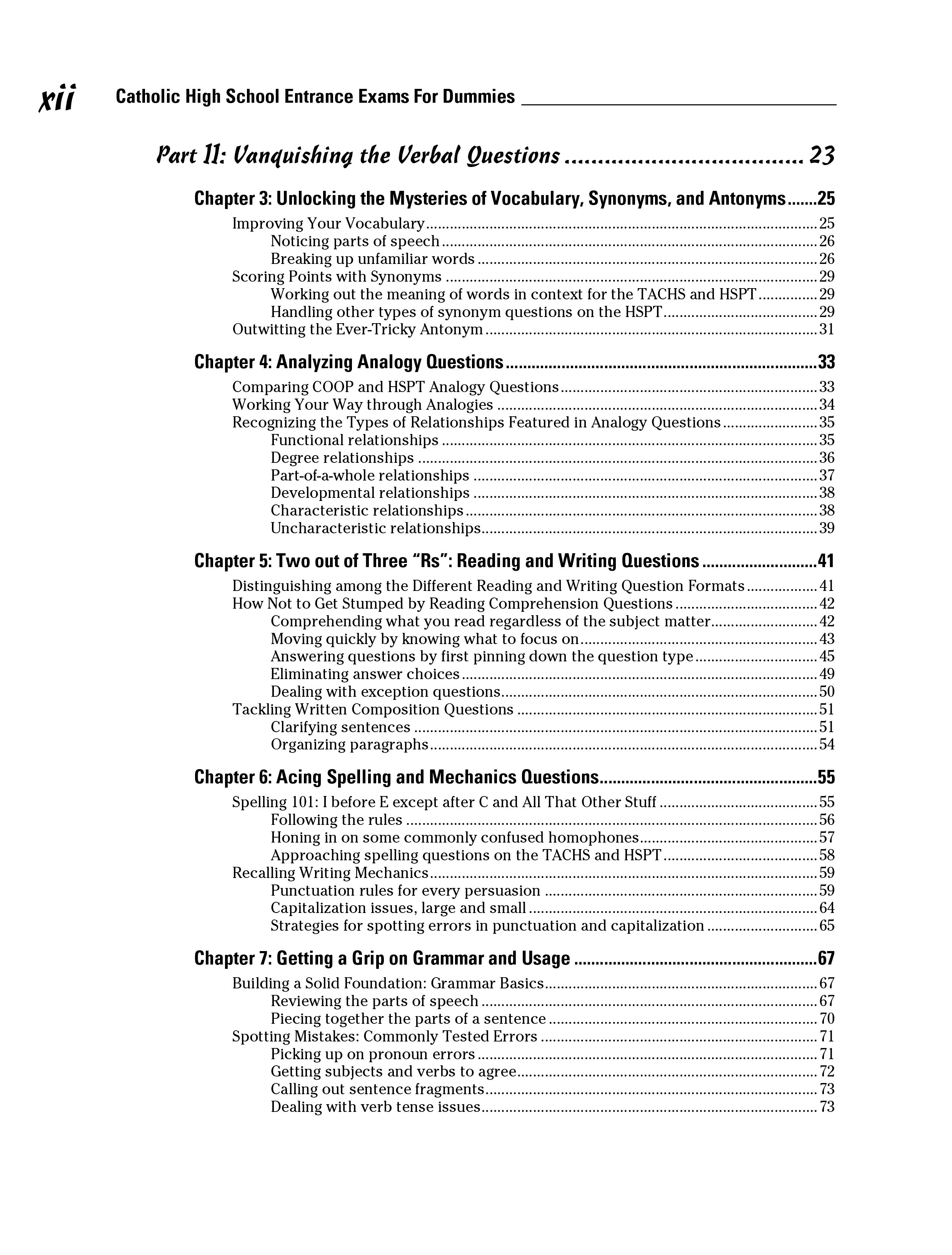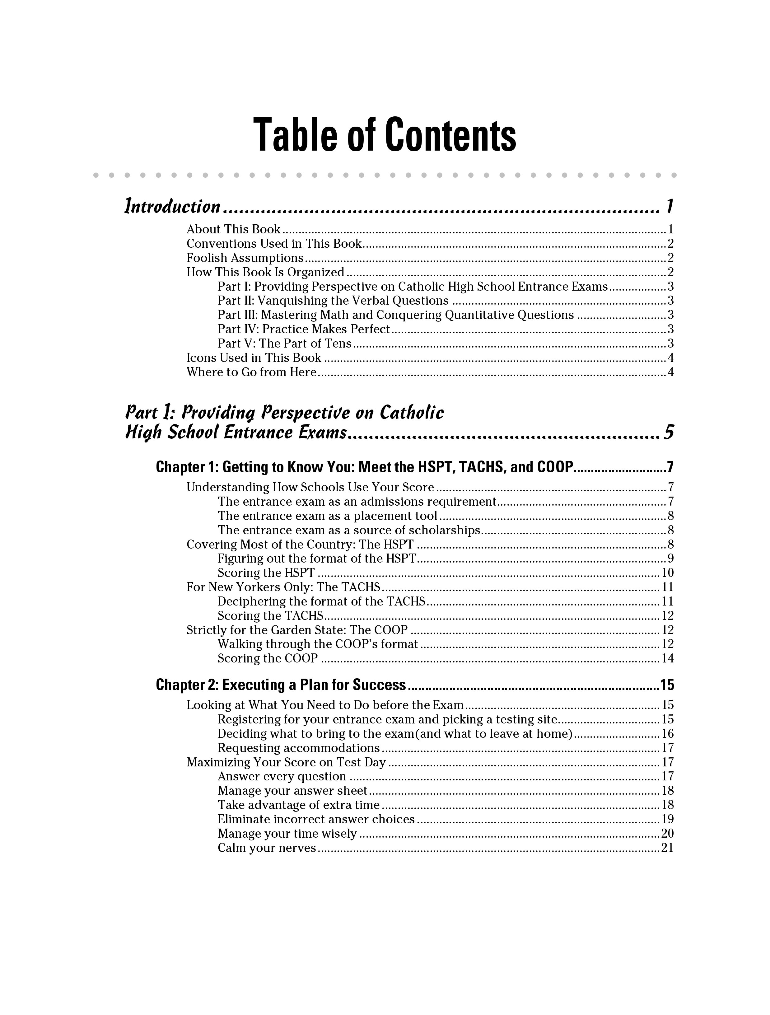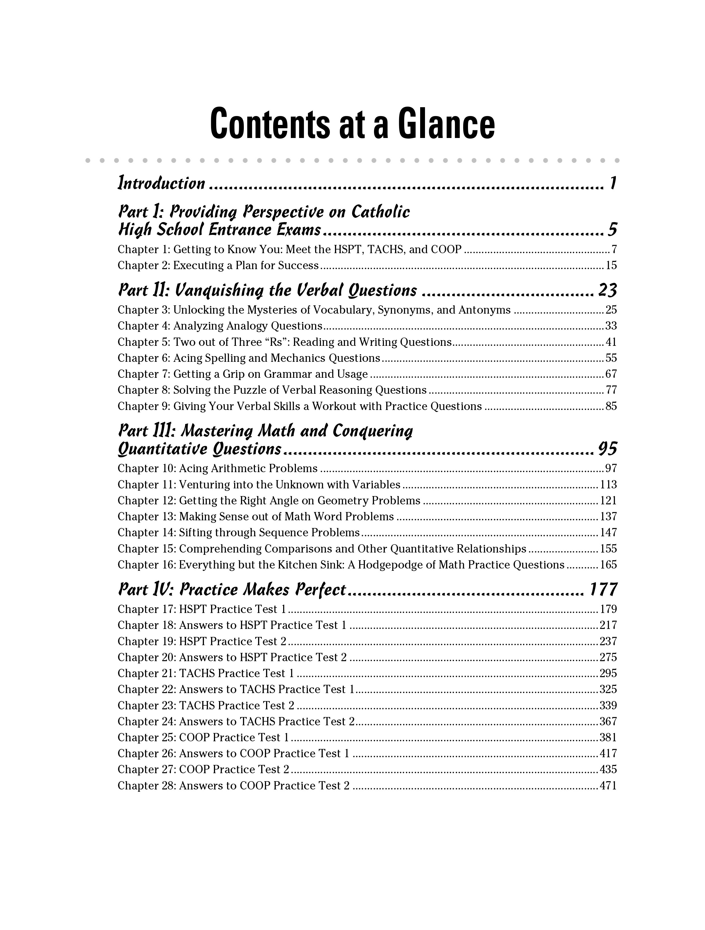 A real-world guide to passing the entrance exam for Catholic high schoolCatholic High School Entrance Exams For Dummies provides students and their parents with an efficient and effective way to prepare for the HSPT, TACHS, and COOP-the three entrance exams used by Catholic high schools. Included areSix full-length practice testsTest-taking tips from the expertsThorough reviews of each test's formatWith full sample tests, up-to-date questions, and a comprehensive review of the basics in each category, Catholic High School Entrance Exams For Dummies is a family's ticket to education success.