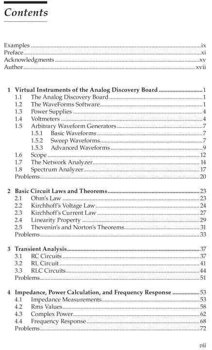 The book provides instructions on building circuits on breadboards, connecting the Analog Discovery wires to the circuit under test, and making electrical measurements. Various measurement techniques are described and used in this book, including: impedance measurements, complex power measurements, frequency response measurements, power spectrum measurements, current versus voltage characteristic measurements of diodes, bipolar junction transistors, and Mosfets. The book includes end-of-chapter problems for additional exercises geared towards hands-on learning, experimentation, comparisons between measured results and those obtained from theoretical calculations.