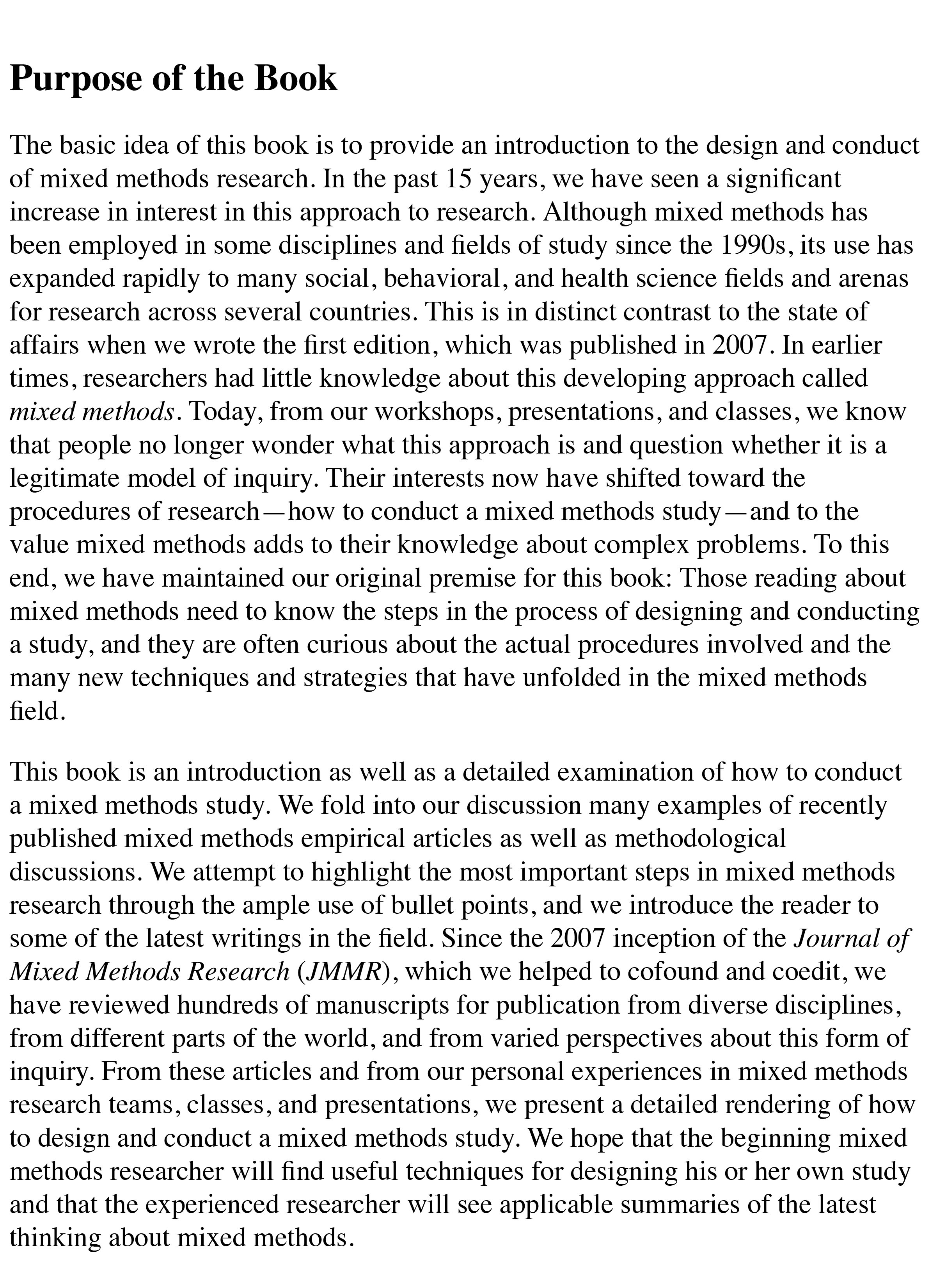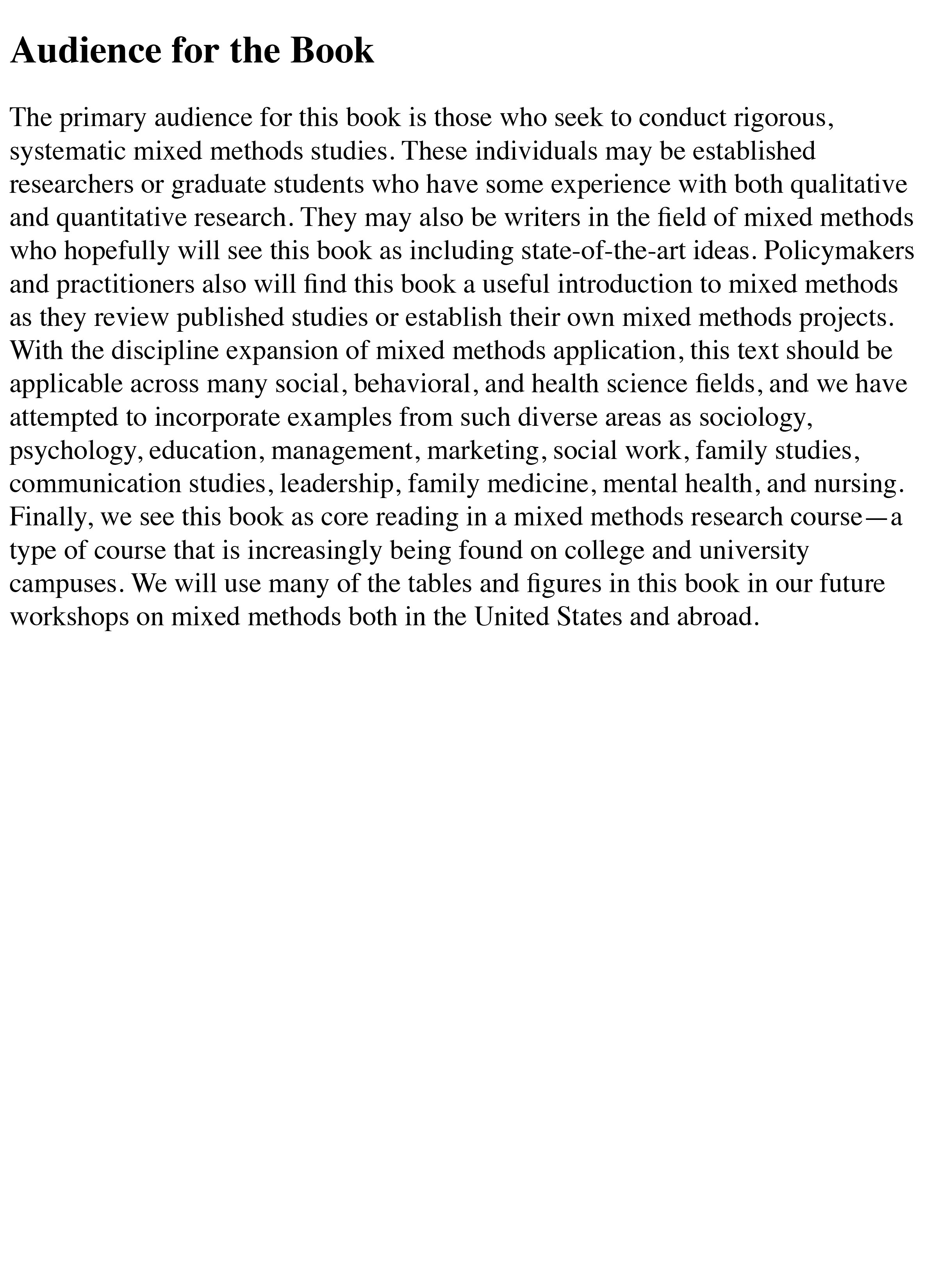 This text is intended for use in Intermediate/Advanced Research Methods, Mixed Methods, Research Design, and Social Research Methods courses across the social and behavioral sciences.