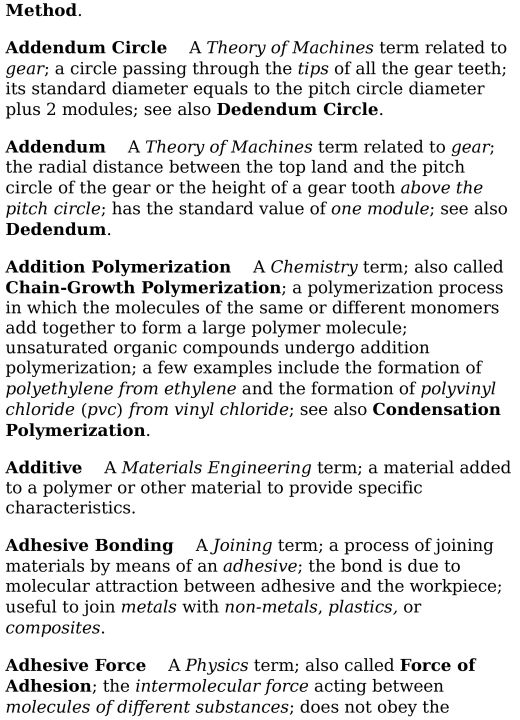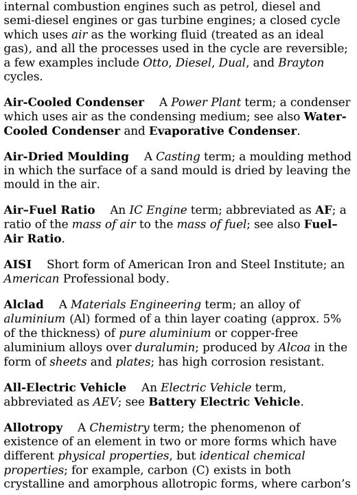 This book contains important words and terminologies of the core subjects in mechanical engineering such as engineering mechanics, strength of materials, fluid mechanics, thermodynamics, IC engines, heat and mass transfer, refrigeration and air-conditioning, manufacturing processes, theory of machines, industrial engineering and management, electric vehicles, etc. that are explained in a concise and lucid manner. The contents also touch upon some terminologies of basic science subjects. This dictionary is an easy-to-use and a practical resource which will be highly useful for undergraduate and postgraduate students, researchers, and industry professionals in the field of mechanical engineering.