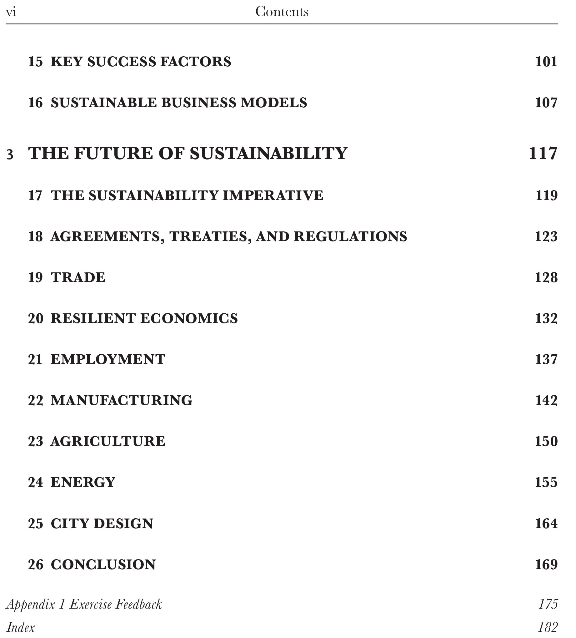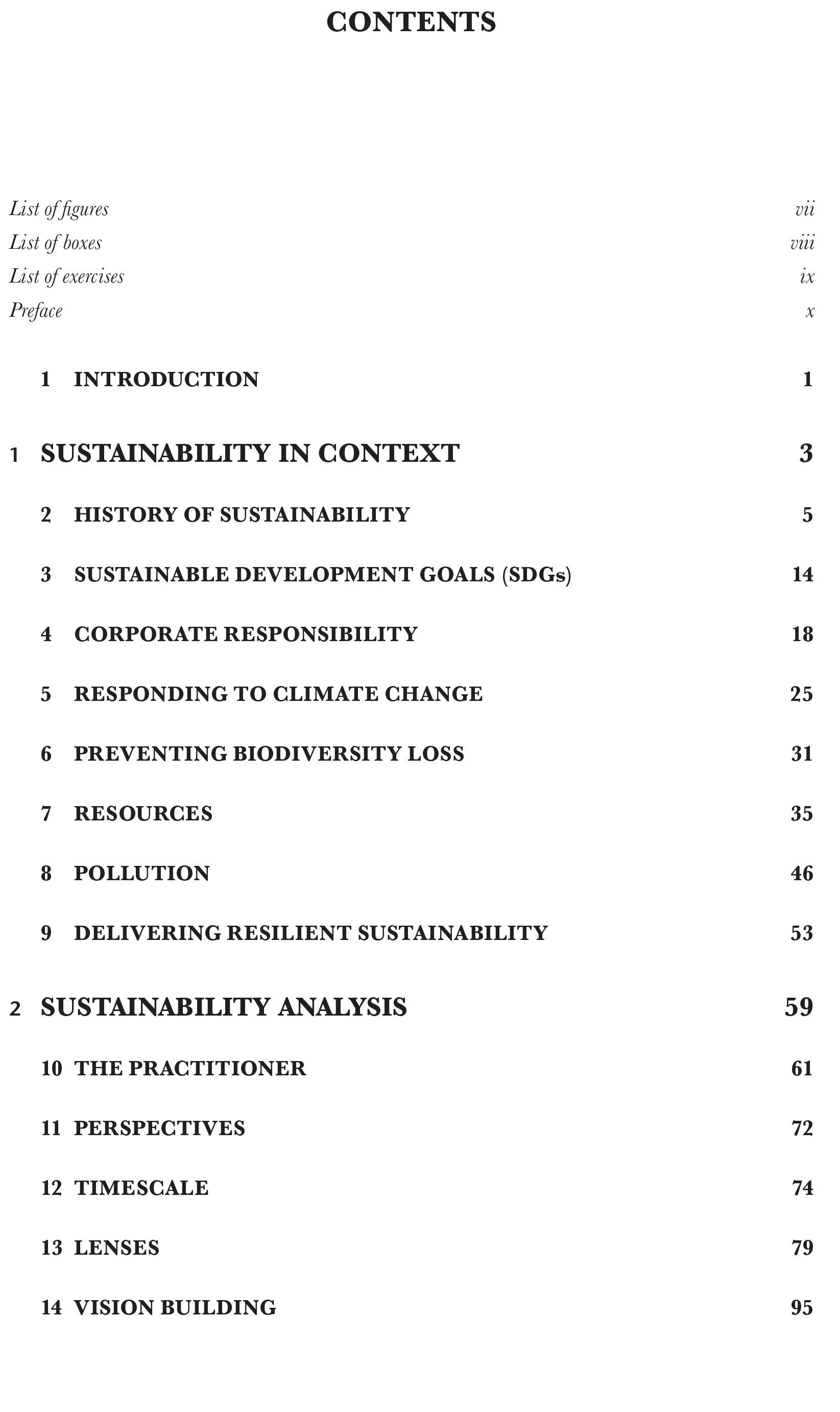The book is structured around three parts in order to assess the context, the goals, and the applications of sustainable business. The first part provides the foundation for understanding the core issues in sustainable business including, the history of sustainability, the sustainable development goals, corporate social responsibility, responding to climate change and delivering resilient sustainability. The second part offers a framework for sustainability analysis, which cuts through the complexity of multiple overlapping issues providing application to real life practice of policy makers and businesses. The final part offers more sophisticated examination of businesses and sustainable resilience.