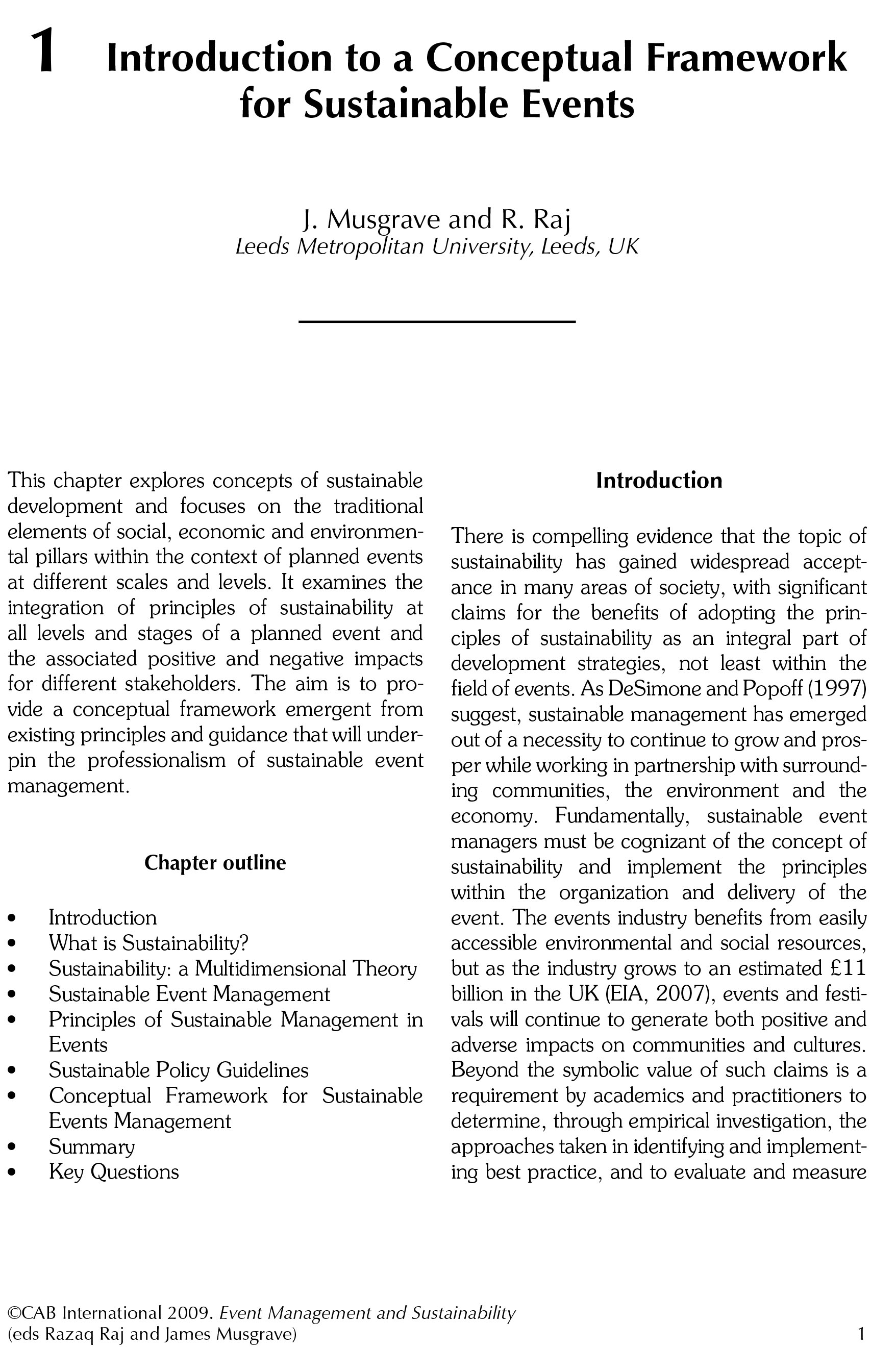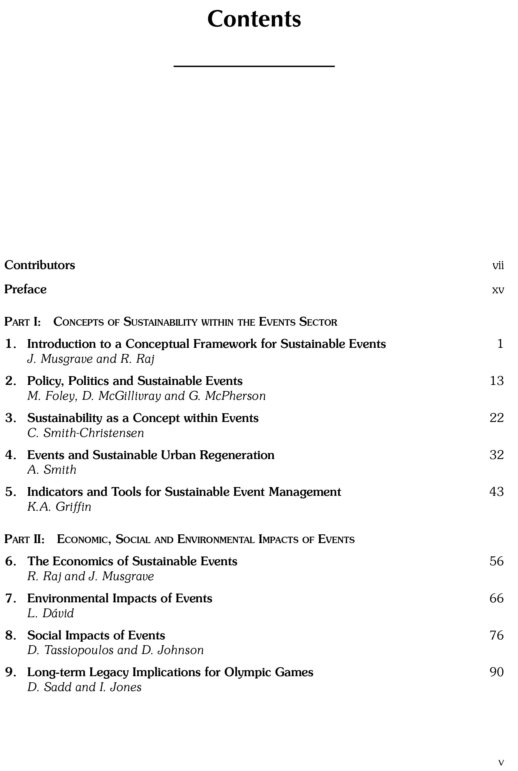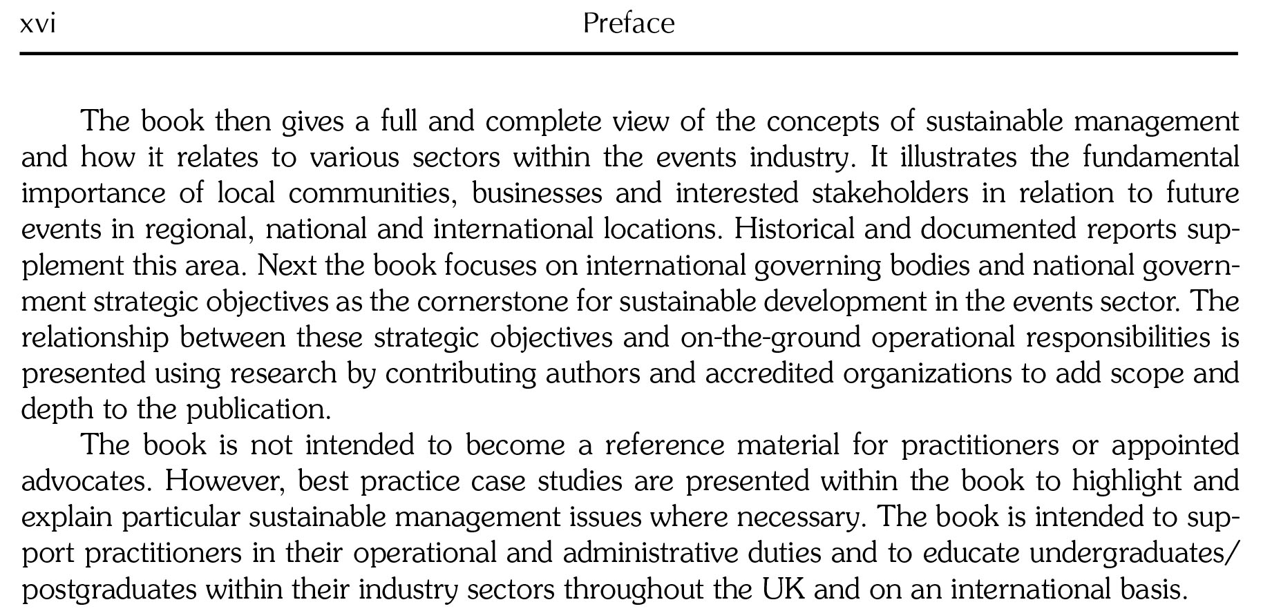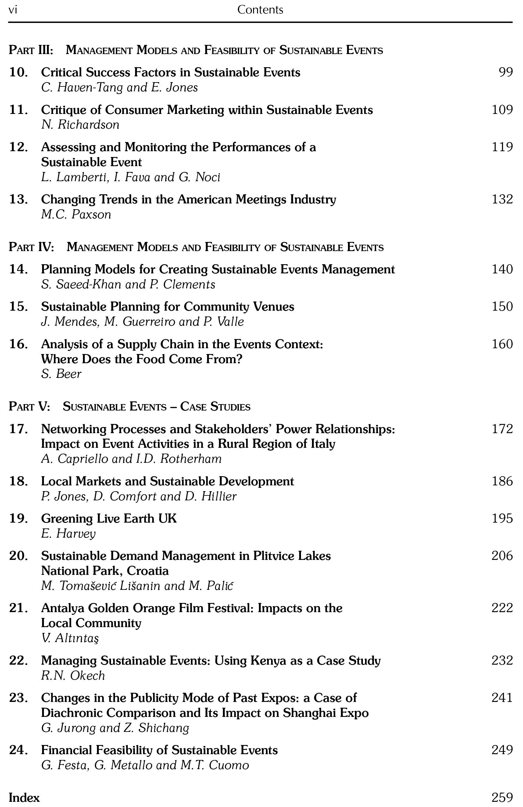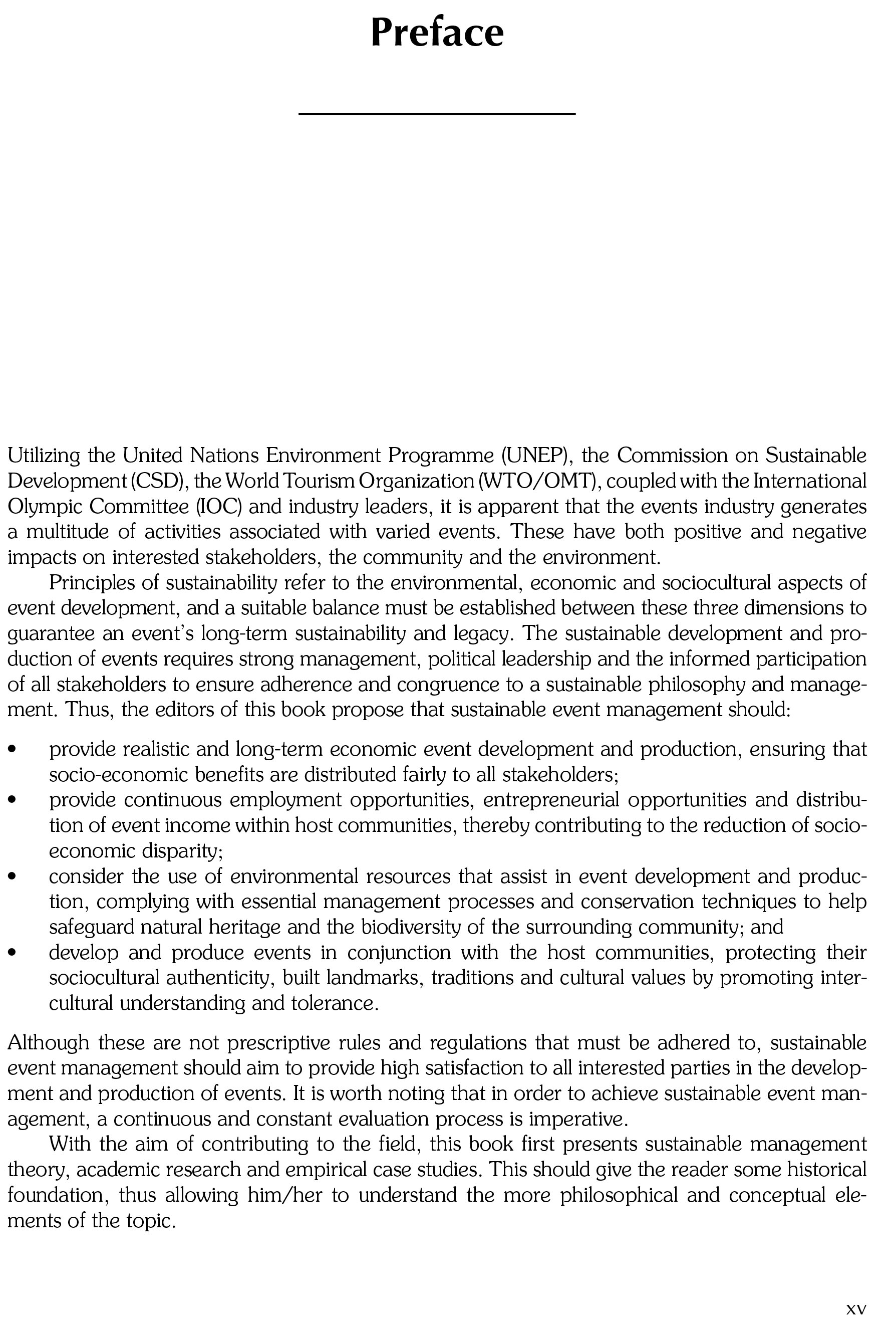 Sustainable management is an important consideration for businesses and organisations, and the enormous number of tourism events taking place requiring facilities, power, transport, people and much more makes sustainable event planning a considerable priority. By looking at mega events, sports events, conferences and festivals, this book uses best practice case studies to illustrate sustainable management issues and practical considerations that managers need to apply, providing an essential reference for researchers and students in leisure and tourism.