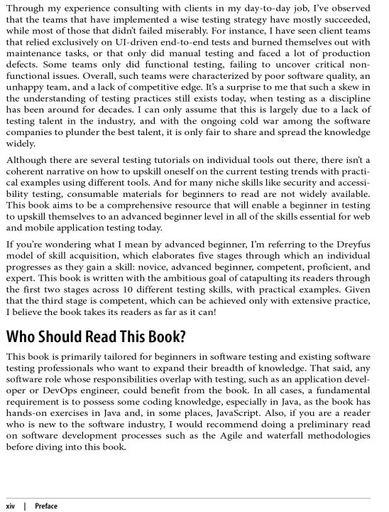 Testing is a critical discipline for any organization looking to deliver high-quality software. This practical book provides software developers and QA engineers with a comprehensive one-stop guide to testing skills in 10 different categories. You'll learn appropriate strategies, concepts, and practical implementation knowledge you can apply from both a development and testing perspective for web and mobile applications.
