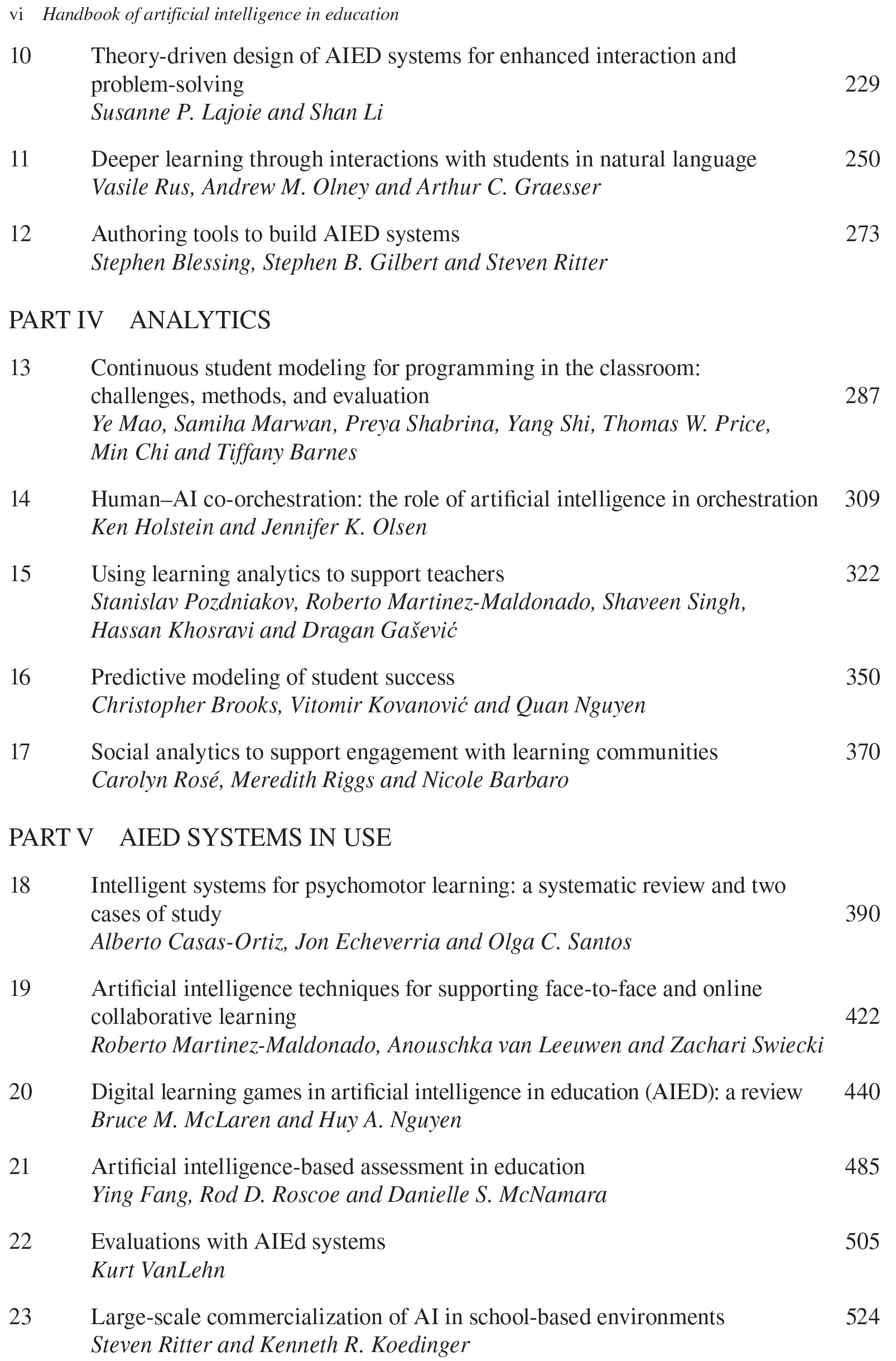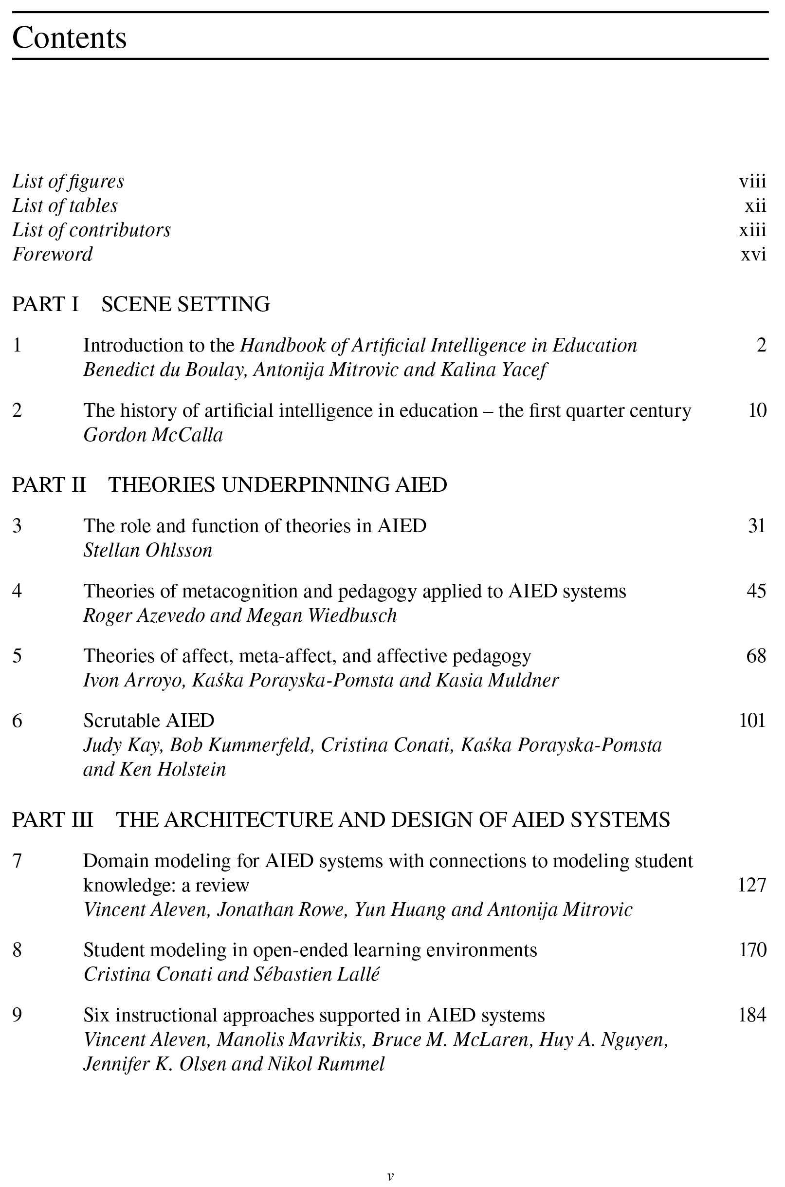 Gathering insightful and stimulating contributions from leading global experts in Artificial Intelligence in Education (AIED), this comprehensive Handbook traces the development of AIED from its early foundations in the 1970s to the present day. The Handbook evaluates the use of AI techniques such as modelling in closed and open domains, machine learning, analytics, language understanding and production to create systems aimed at helping learners, teachers, and educational administrators. Chapters examine theories of affect, metacognition and pedagogy applied in AIED systems; foundational aspects of AIED architecture, design, authoring and evaluation; and collaborative learning, the use of games and psychomotor learning. It concludes with a critical discussion of the wider context of Artificial Intelligence in Education, examining its commercialisation, social and political role, and the ethics of its systems, as well as reviewing the possible challenges and opportunities for AIED in the next 20 years. Providing a broad yet detailed account of the current field of Artificial Intelligence in Education, researchers and advanced students of education technology, innovation policy, and university management will benefit from this thought-provoking Handbook. Chapters will also be useful to support undergraduate courses in AI, computer science, and education.