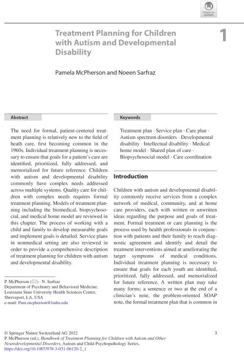 This handbook addresses treatment planning for children with autism spectrum disorder (ASD) and other neurodevelopmental disabilities (NDDs) using a medical home perspective. It examines the medical home model, which has been promoted as the standard of care by the American Academy of Pediatrics since 2002, emphasizing collaboration between patients, families, and providers to optimize care. The handbook addresses treatment planning, including the coordination of the care provided by multiple specialists with a clear, shared vision for maximizing each child’s potential.