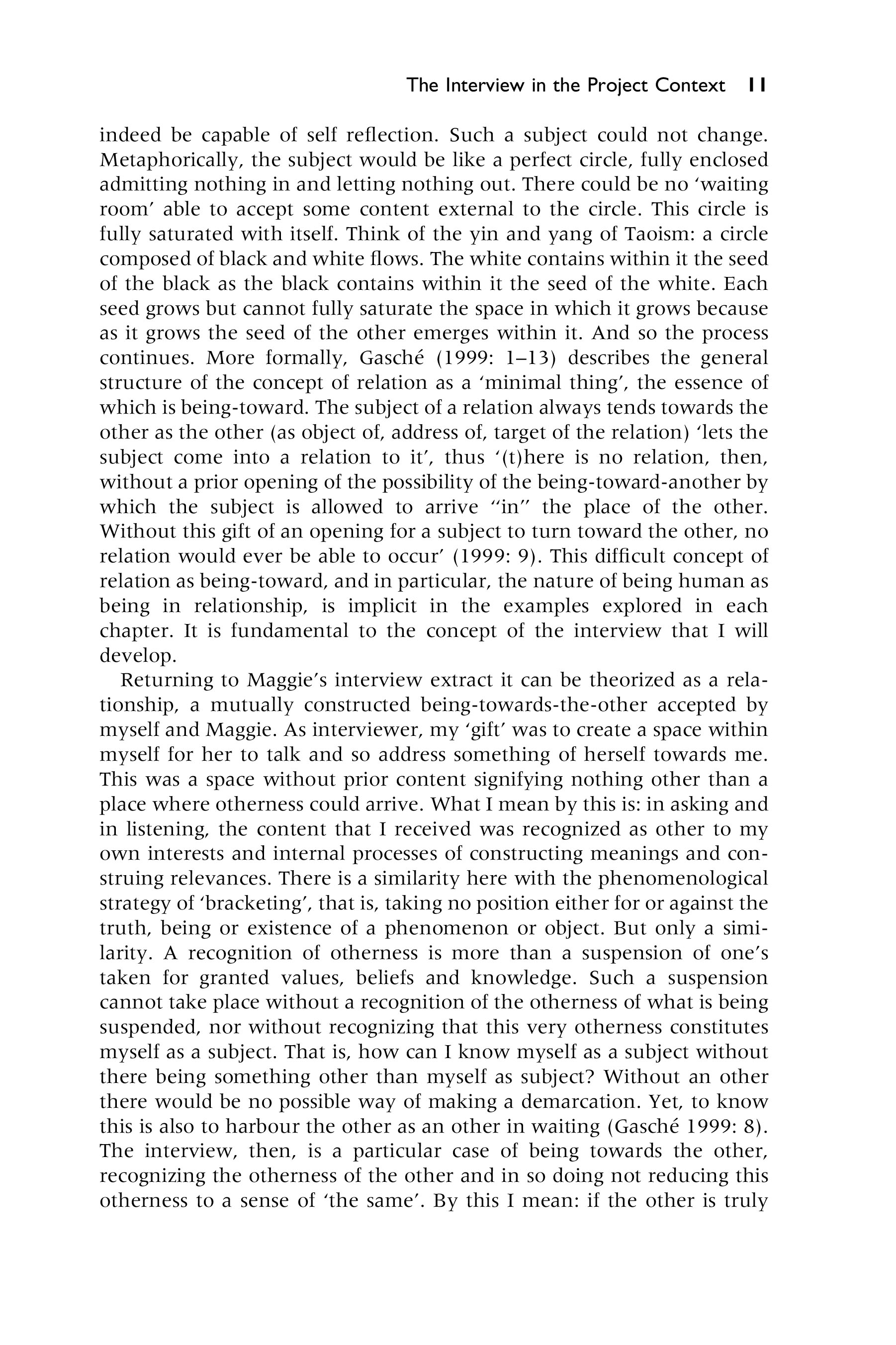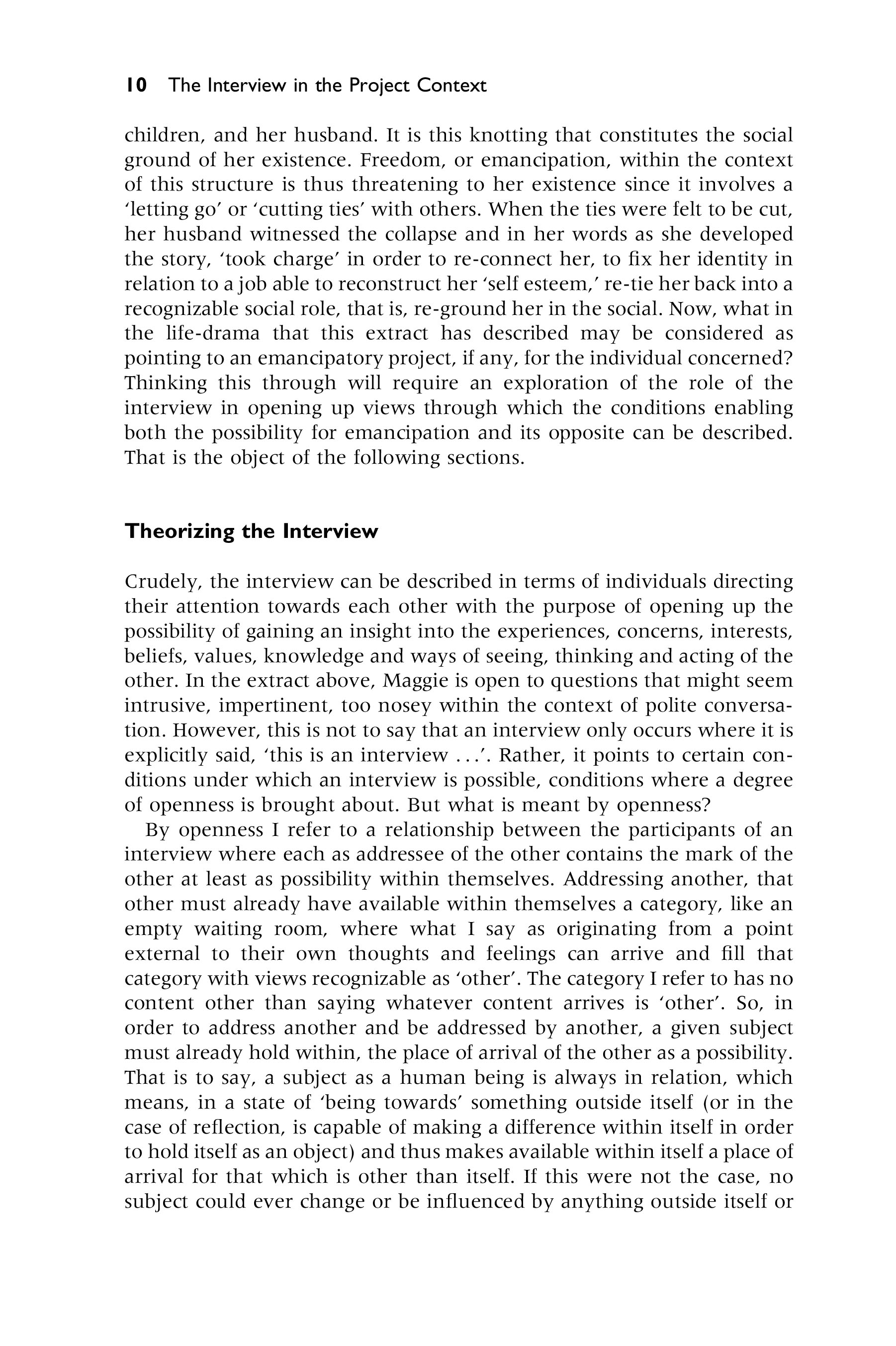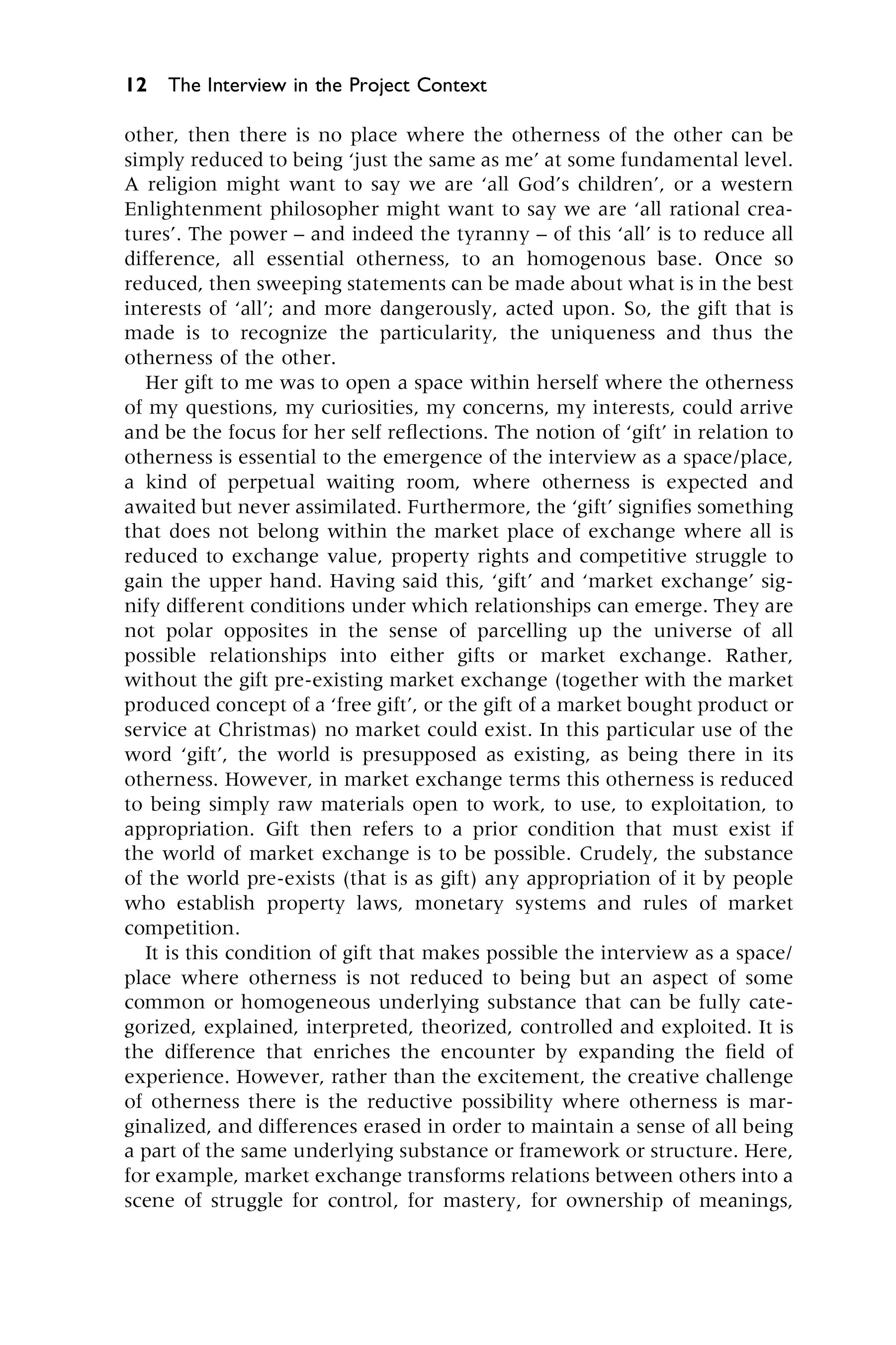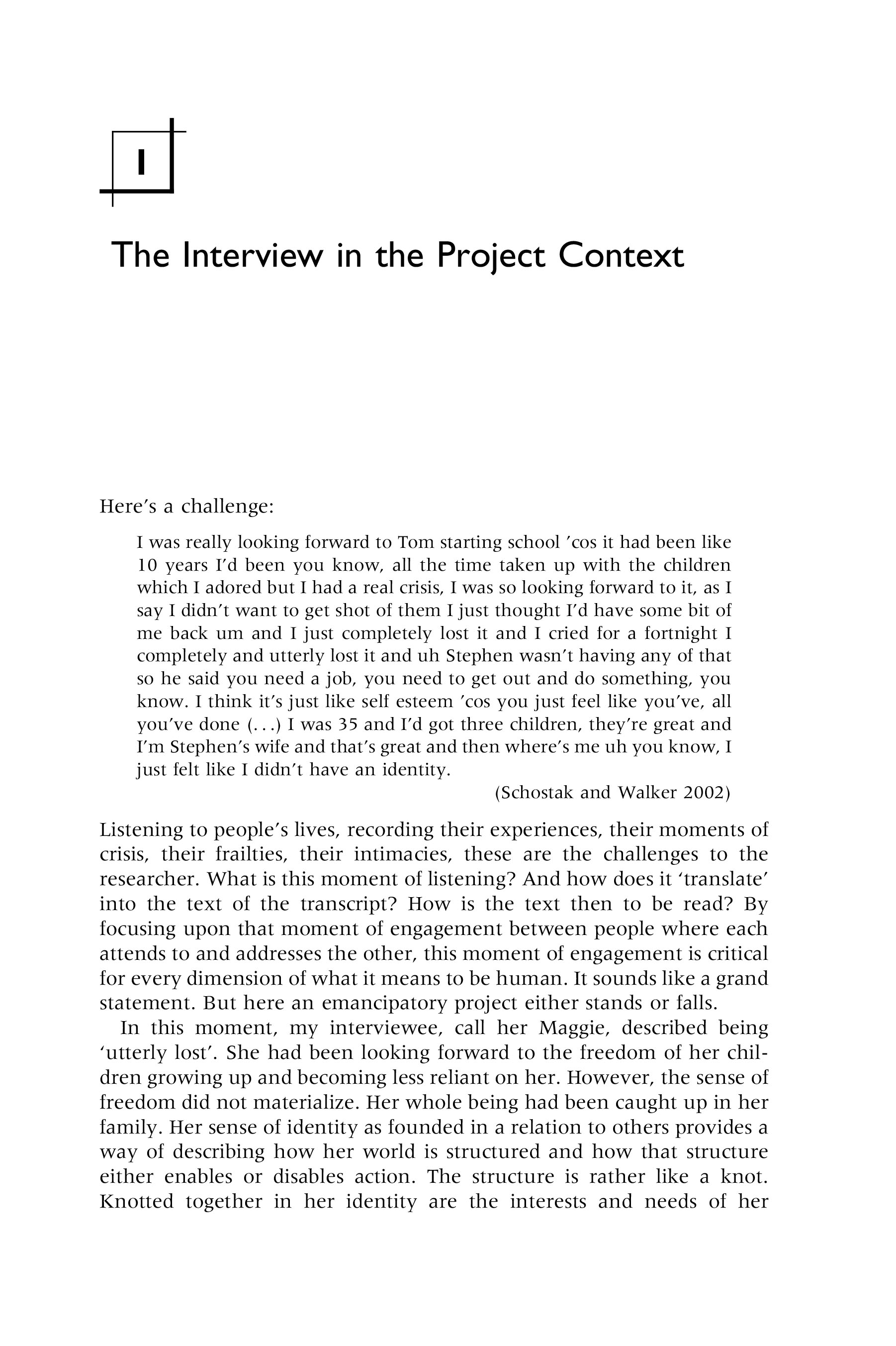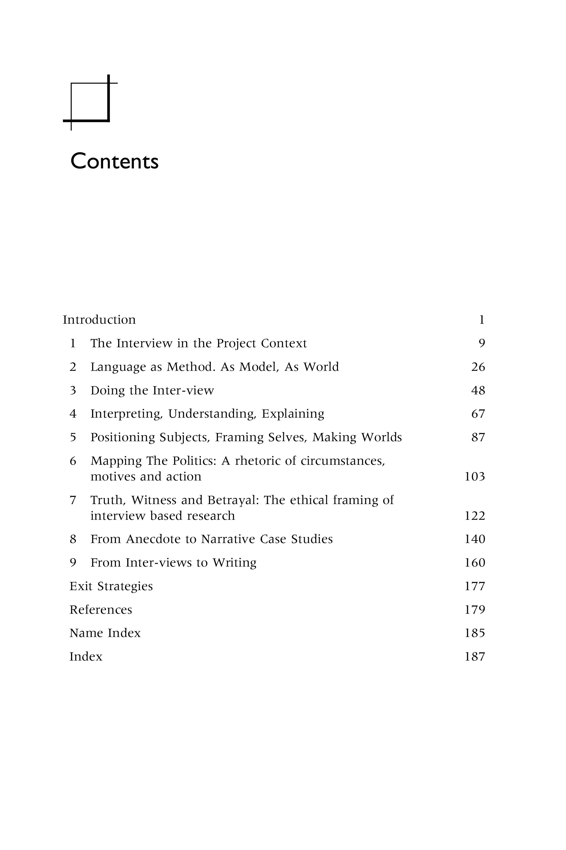 What makes the book distinctive is its focus on interviewing not just as a tool to be used within other frameworks such as case study, action research, evaluation and surveys, but as an approach to organise a project as a whole, to provide frameworks for organising perspectives on the multiple ‘worlds’ of everyday life. It is argued that every project, every methodology, every theoretical perspective has its own rhetorical framework that interacts with the ‘world’ as subject of study or focus for intervention. The interview, as defined in this book, is both the process of constituting and de-constructing world views – it is the inter-view, the place between worlds. Without the ‘inter-view’ no dialogue and no alternatives as a basis for difference, change, and development would be possible. The inter-view as conceived in the book is fundamental to qualitative research as an emancipatory project.